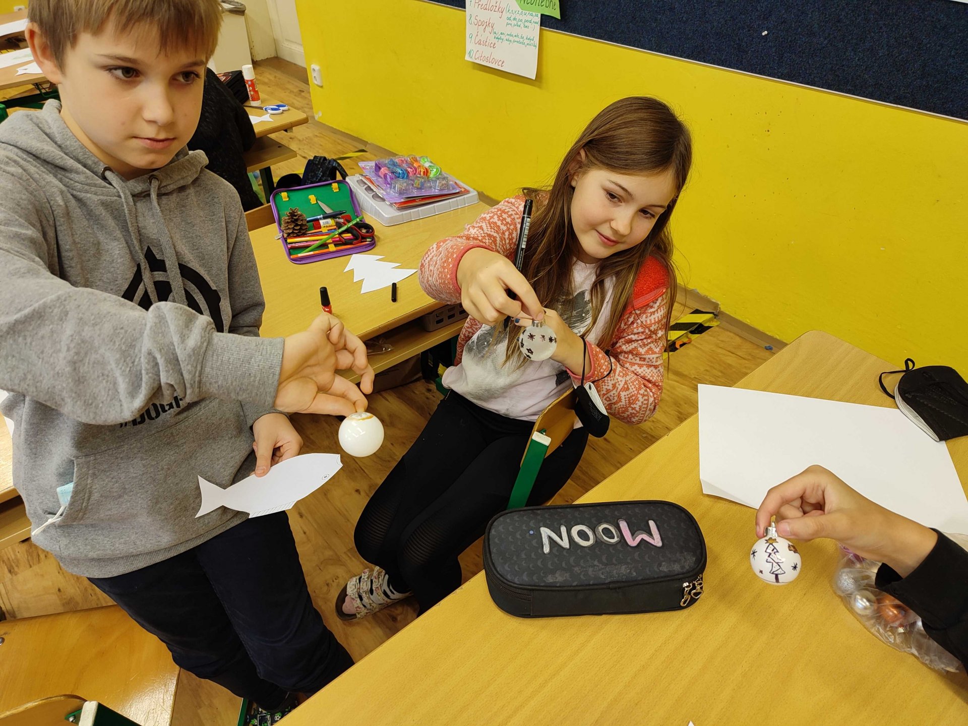 Děti se na vánoční dílničky moc těšily, snad každý něco donesl. Každý si vytvořil svou originální kouličku. Zatím nám dělají krásnou atmosféru ve škole.
