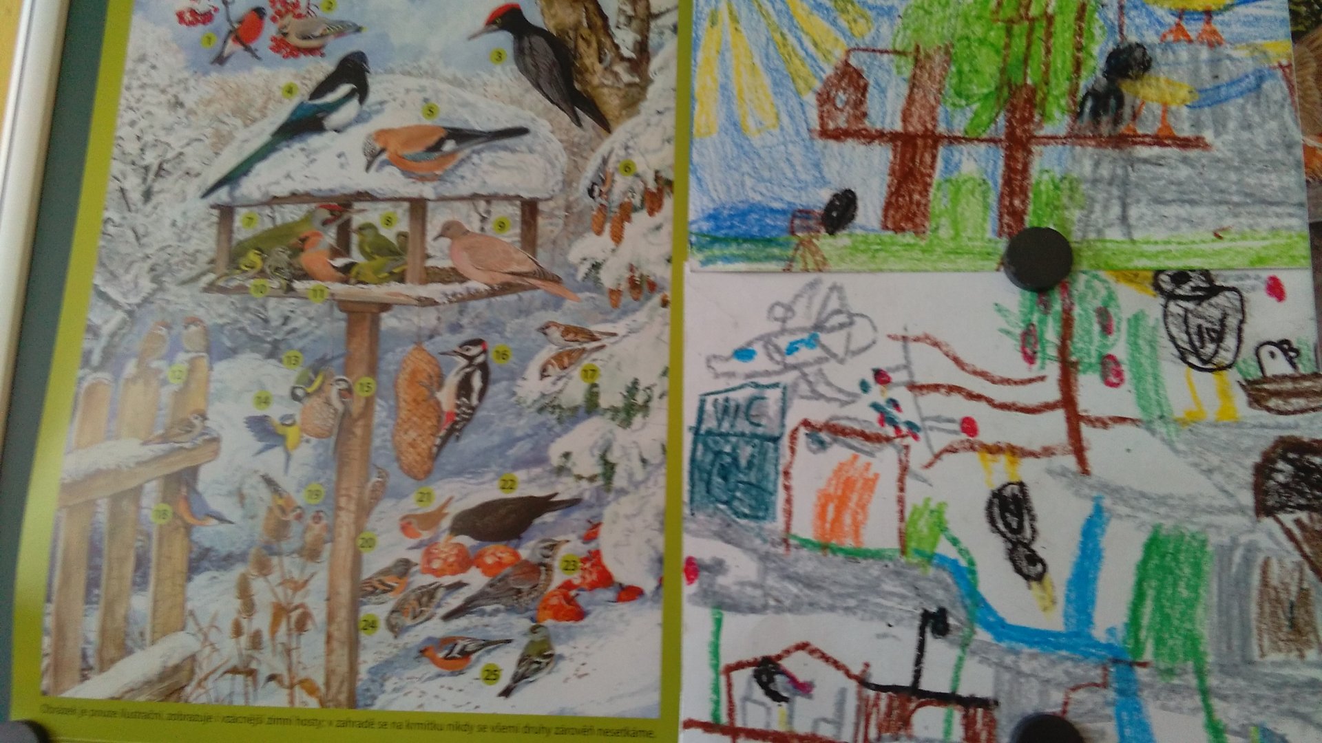 Dozvěděli jsme se, co ptáci v zahradě potřebují a jak třeba vytvořit na školní zahradě vhodné podmínky pro krmení a hnízdění ptáčků. Dozvěděli jsme se, proč je potřeba a důležité přikrmovat ptáčky na krmítku po celý rok, seznámili jsme se s predátory a opatření u ptačích budek a krmítek. Moc nás zaujaly živé ukázky, ale nakonec stejně zvítězila veverka. Ve třídě jsme přiřadili také naše barevné ilustrace.