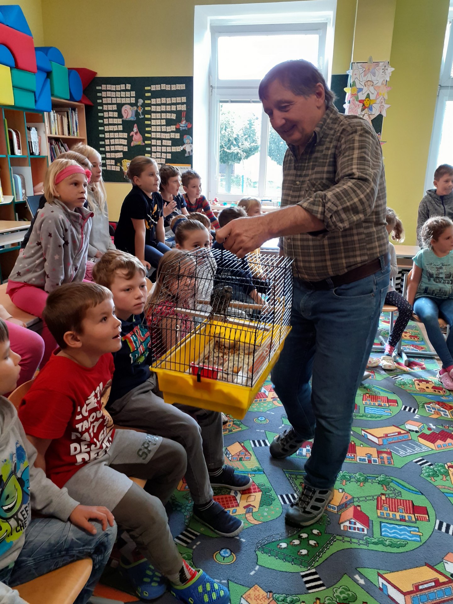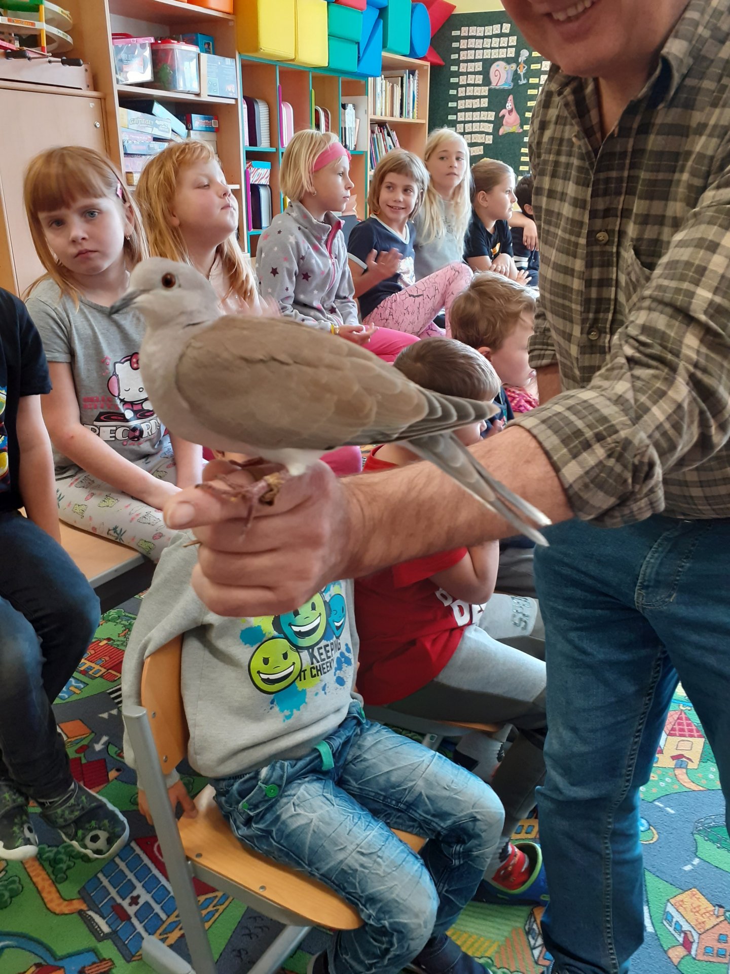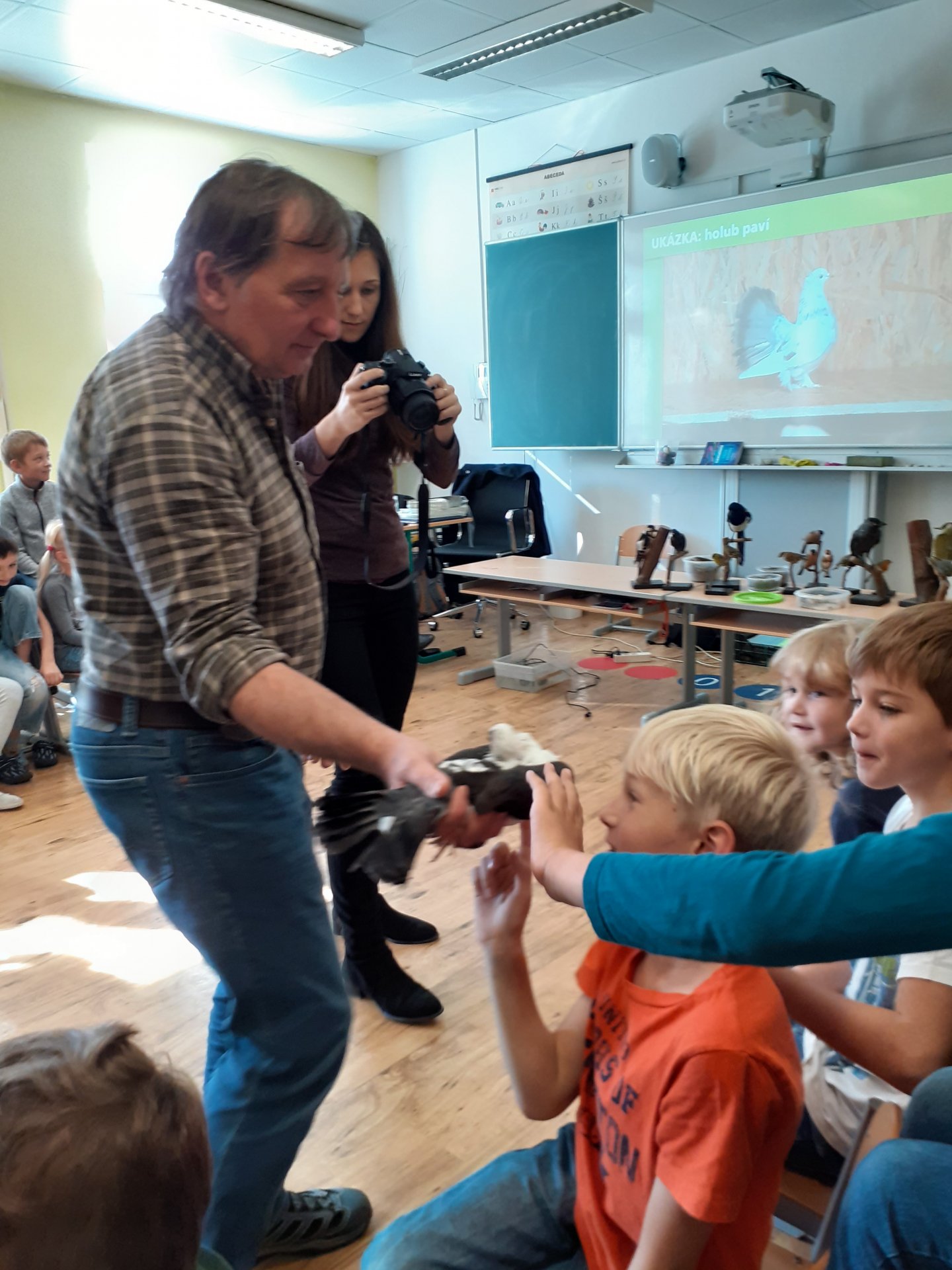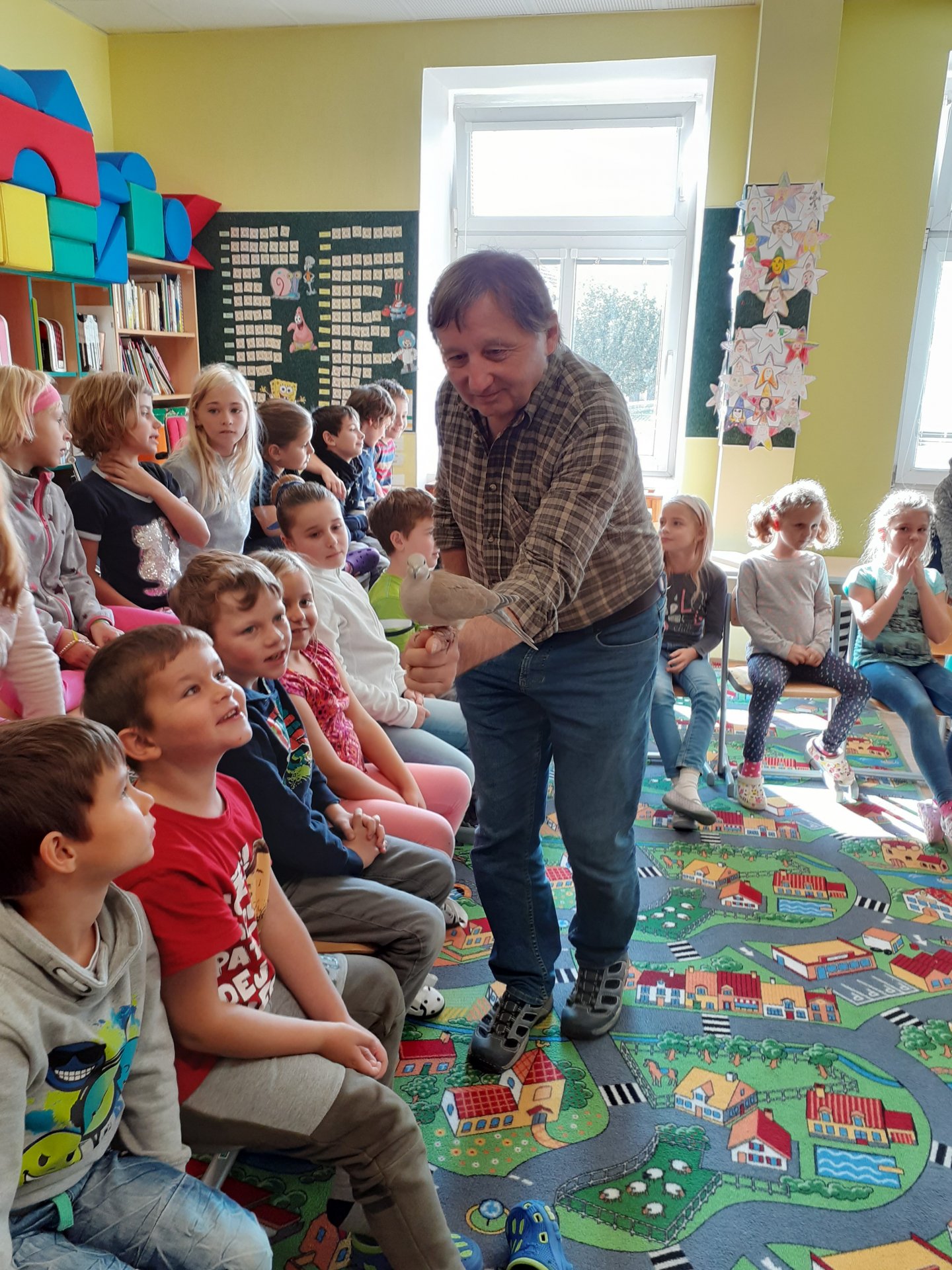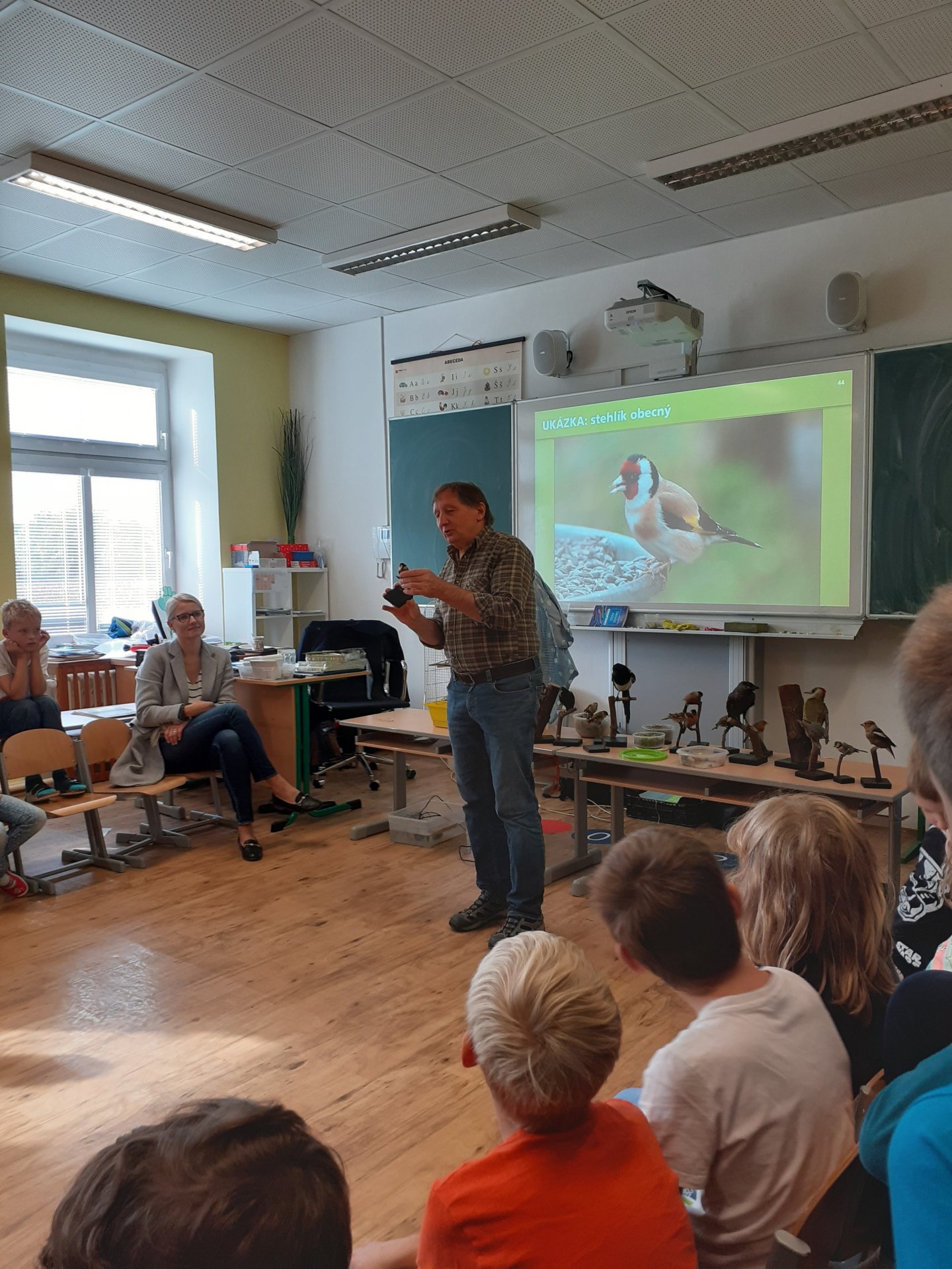 Ve čtvrtek 3. 10. k nám po roce opět zavítal pan Viktor z Ornity s naučným program Divoká školní zahrada. Děti poučil o péči o stálé ptáky, obyvatele našich zahrad, jejich potřebách na podzim a v zimě (výroba pítek, krmítek, vhodné krmivo). Program doplnil promítáním krátkých ukázek a názornou ukázkou exemplářů, ať už těch vycpaných či živých.