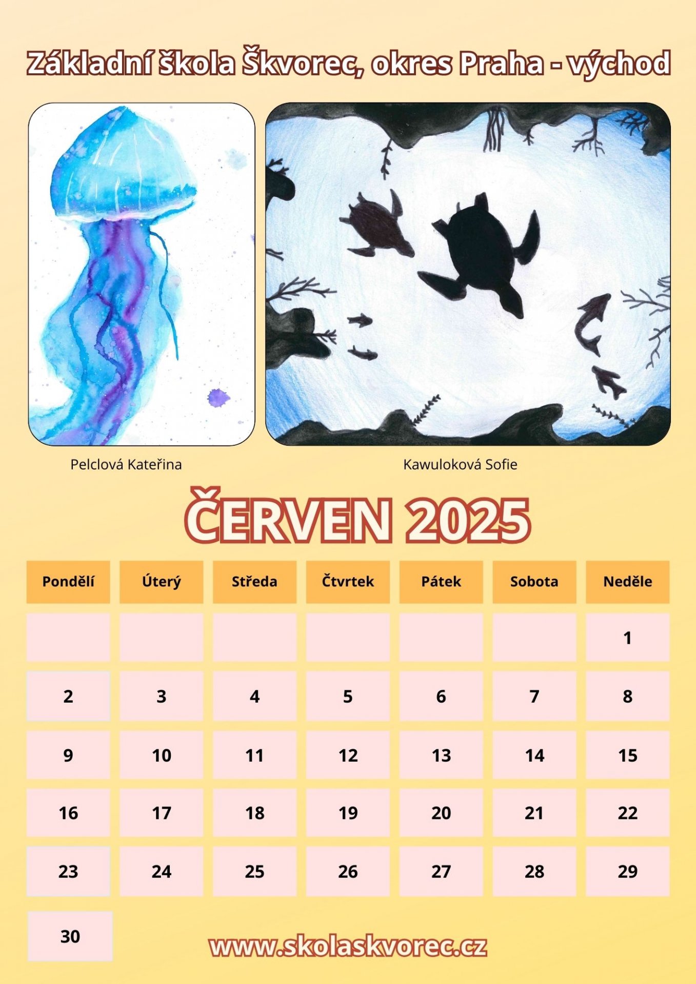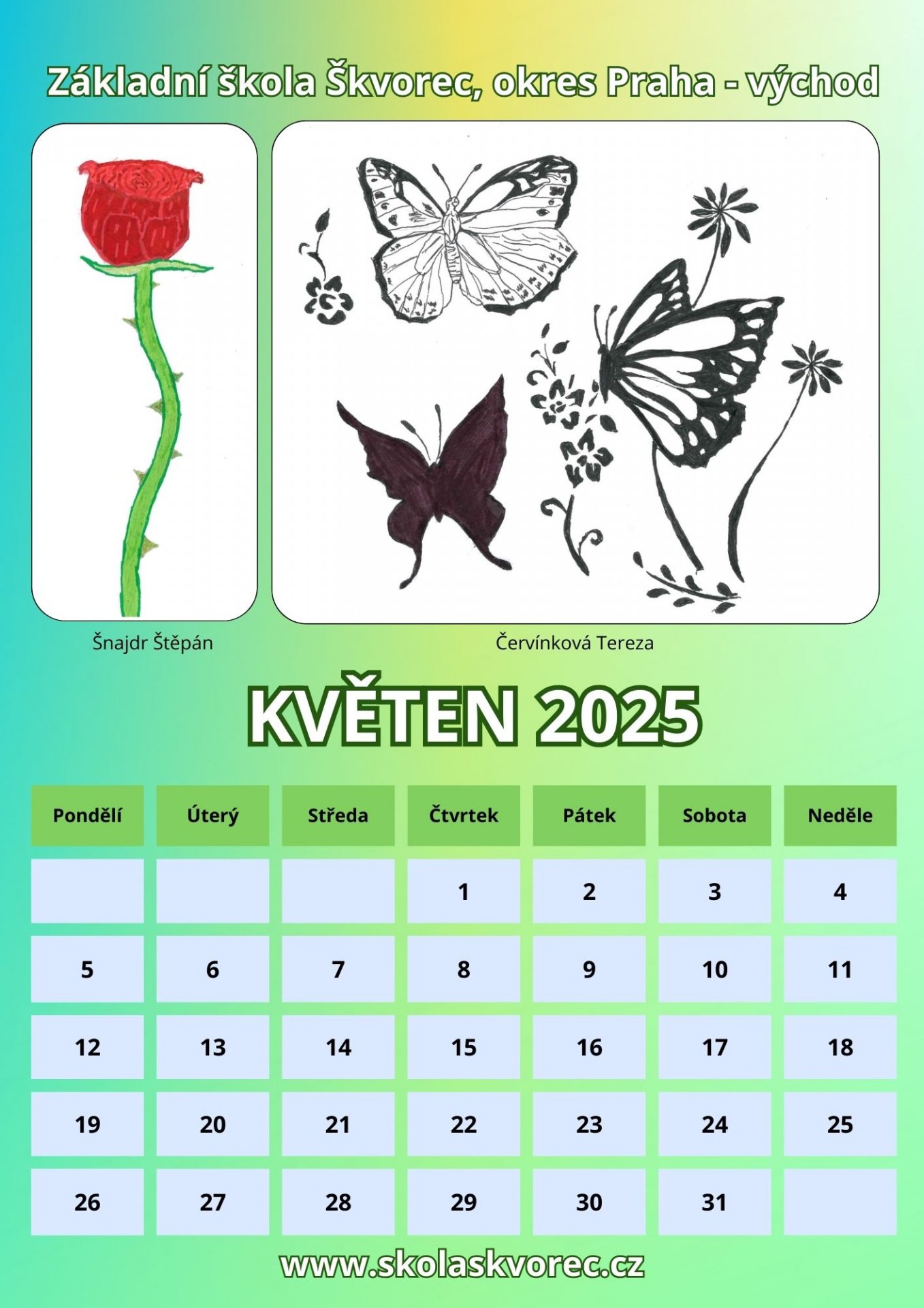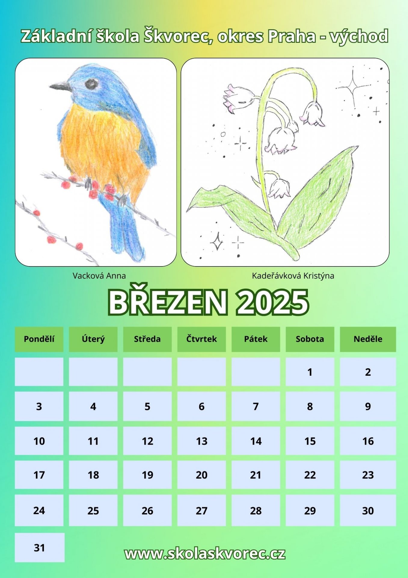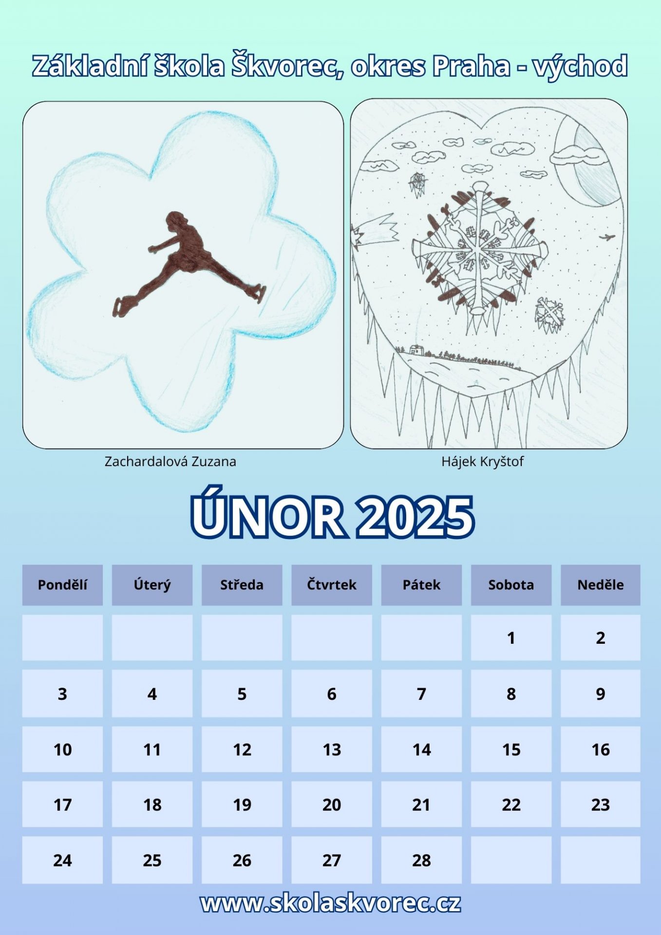 V letošním roce vznikl kalendář na rok 2025 z výtvarných prací žáků 6.B, 7.A a 8.A, přičemž nejvíce prací vzniklo v 7.A. Do kalendáře přispěli svým talentem tito žáci ze 7.A - Hájek Kryštof, Vacková Anna, Kadeřávková Kristýna, Červínková Tereza, Pelclová Kateřina, Kawuloková Sofie, Bizoňová Nicol, Vondráčková Karolína, Kloub Jan, Ducháček Matyáš, Löblová Lucie, Němejcová Kristýna, Tuhá Adéla, Hájek Jáchym, Hubarjev Timur. Kalendář je zakončený společným dílem žáků 7.A (vánoční strom). Děkuji žákům za jejich práci.