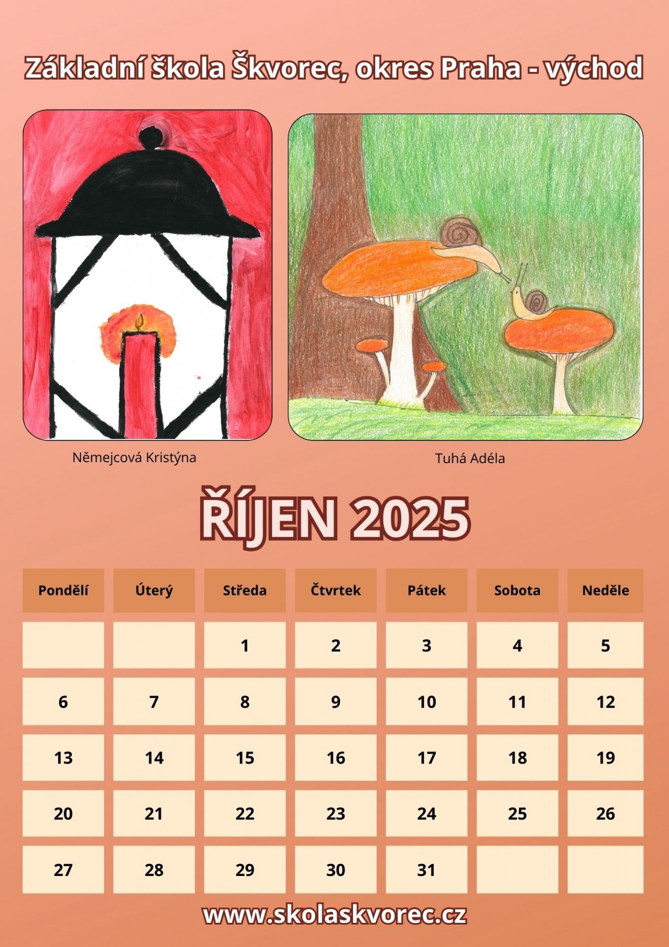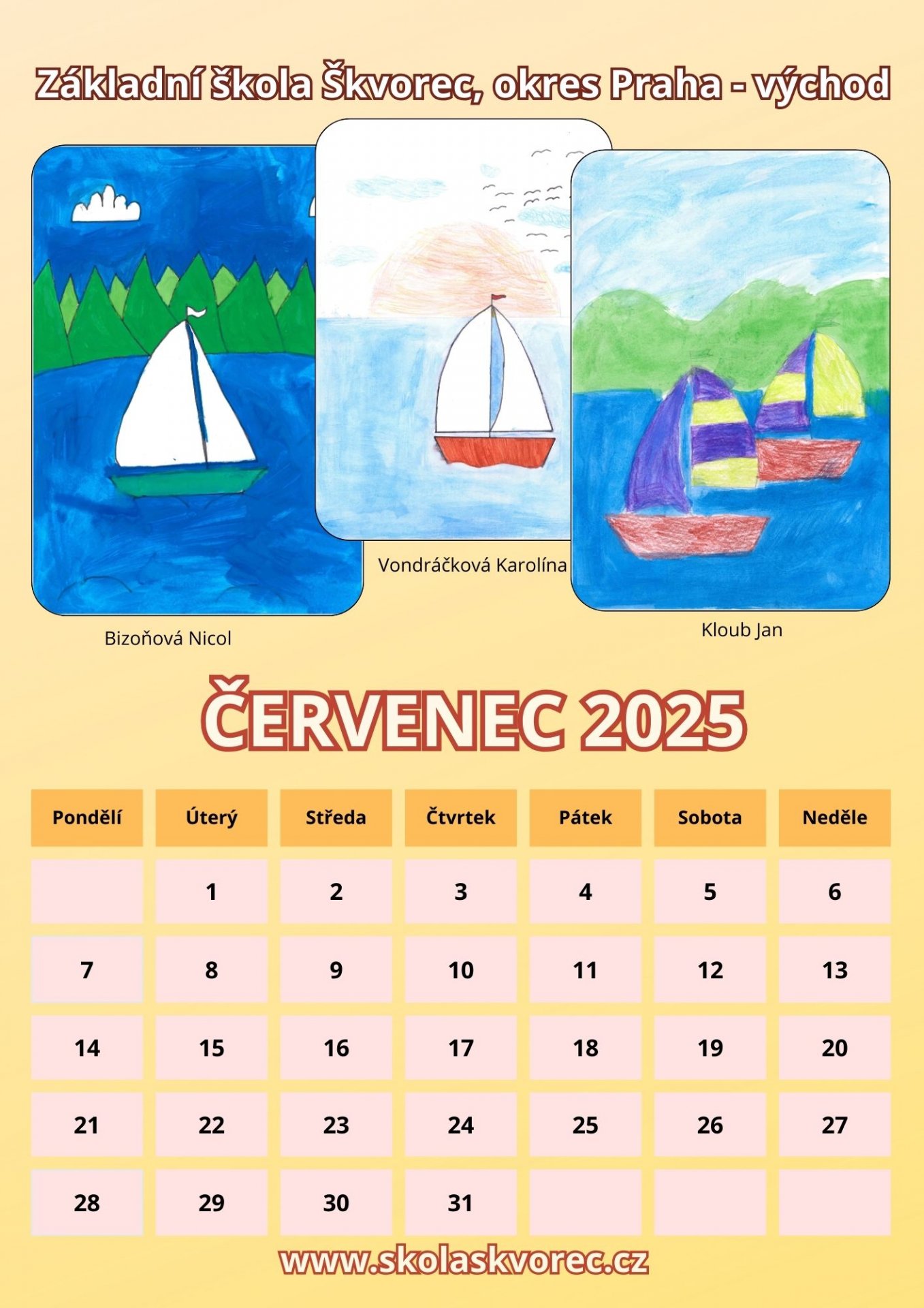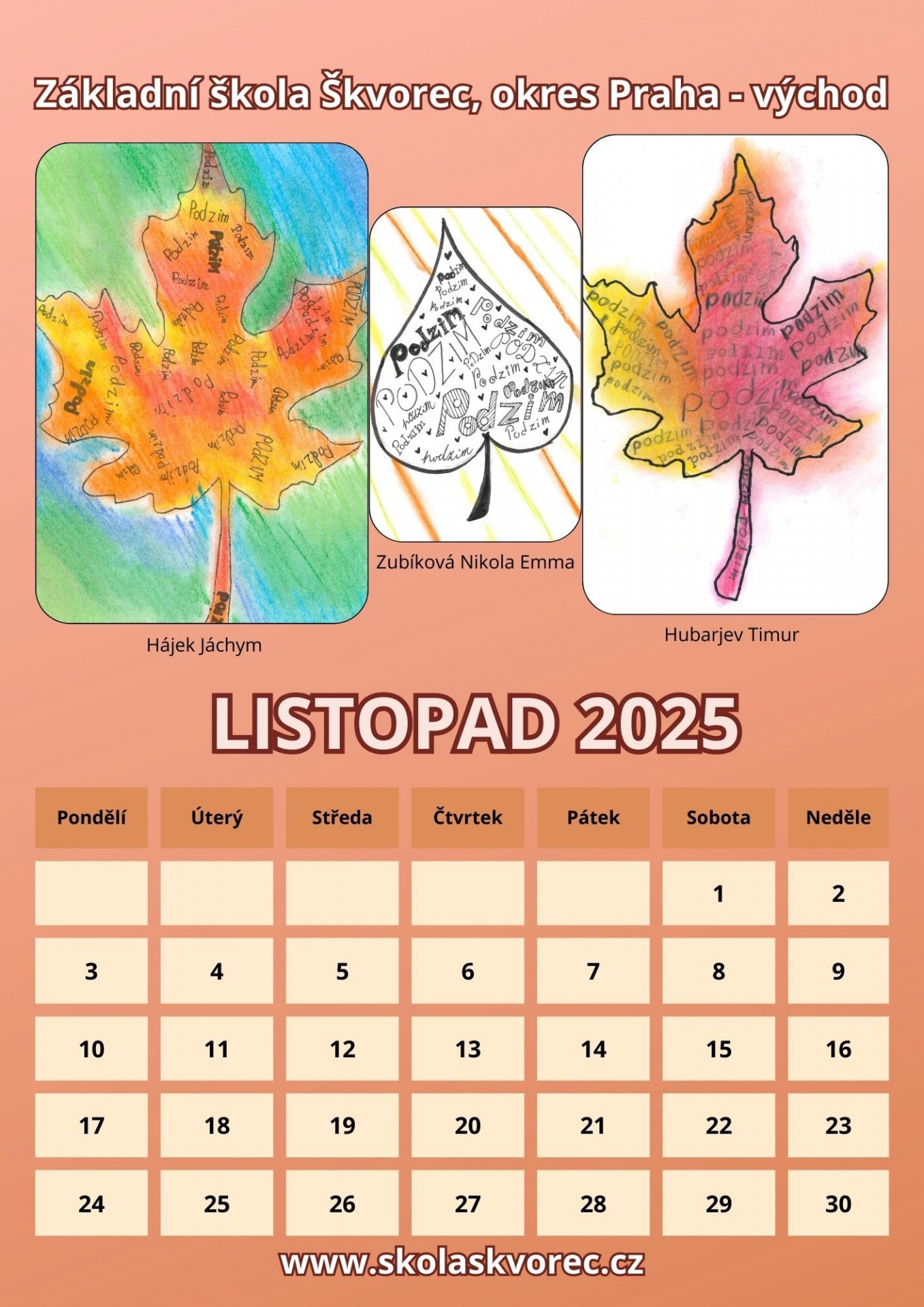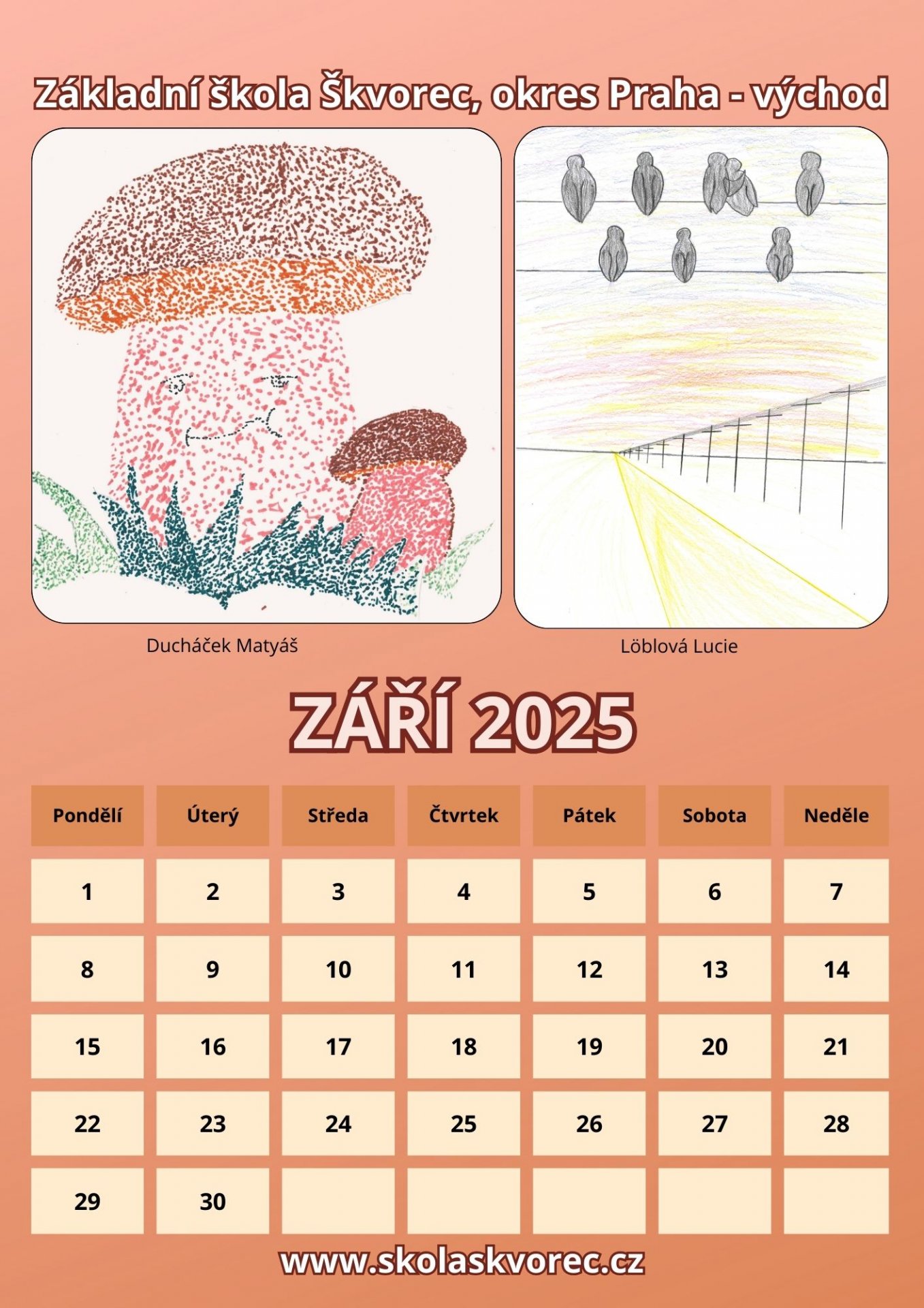 V letošním roce vznikl kalendář na rok 2025 z výtvarných prací žáků 6.B, 7.A a 8.A, přičemž nejvíce prací vzniklo v 7.A. Do kalendáře přispěli svým talentem tito žáci ze 7.A - Hájek Kryštof, Vacková Anna, Kadeřávková Kristýna, Červínková Tereza, Pelclová Kateřina, Kawuloková Sofie, Bizoňová Nicol, Vondráčková Karolína, Kloub Jan, Ducháček Matyáš, Löblová Lucie, Němejcová Kristýna, Tuhá Adéla, Hájek Jáchym, Hubarjev Timur. Kalendář je zakončený společným dílem žáků 7.A (vánoční strom). Děkuji žákům za jejich práci.