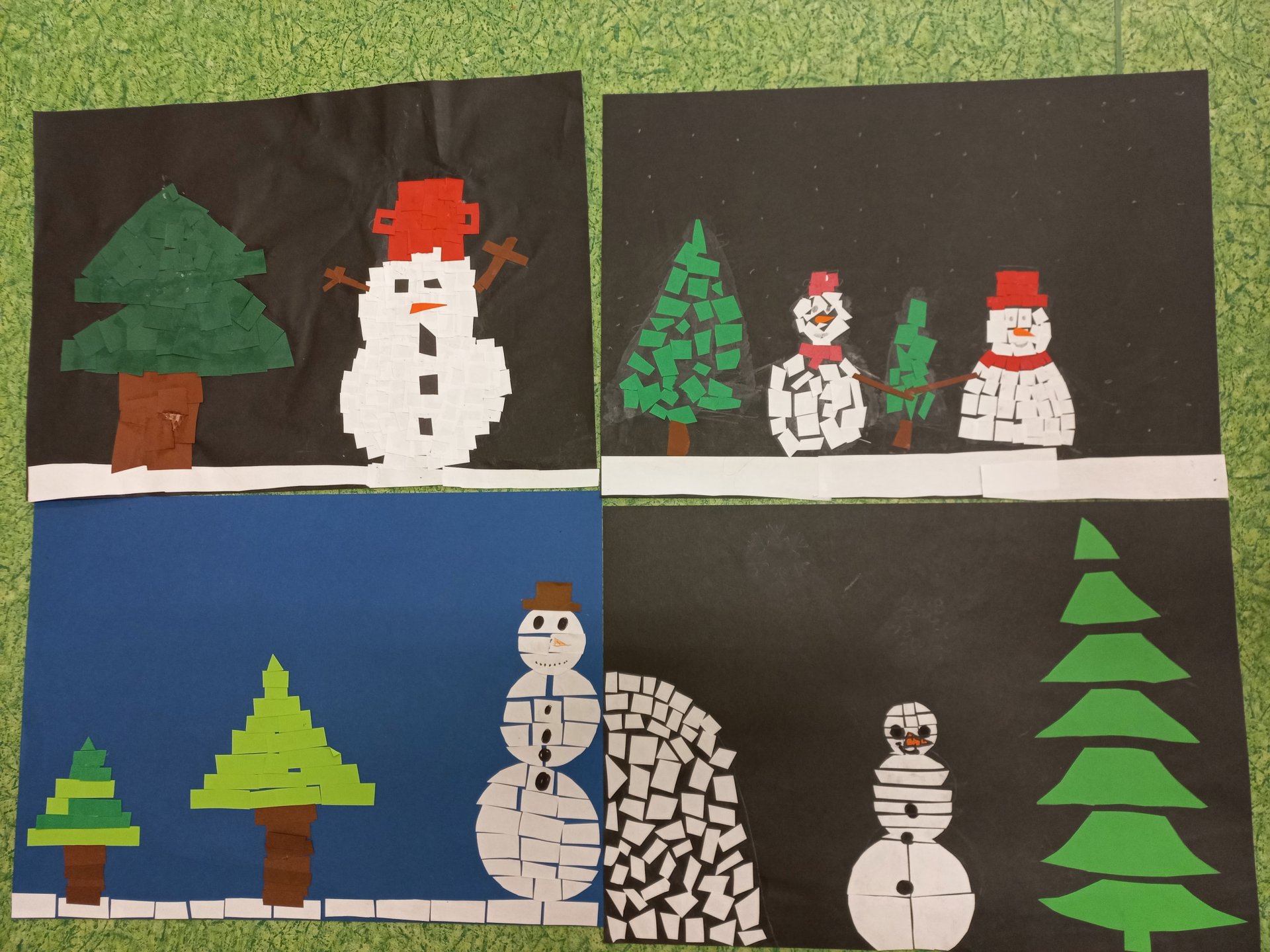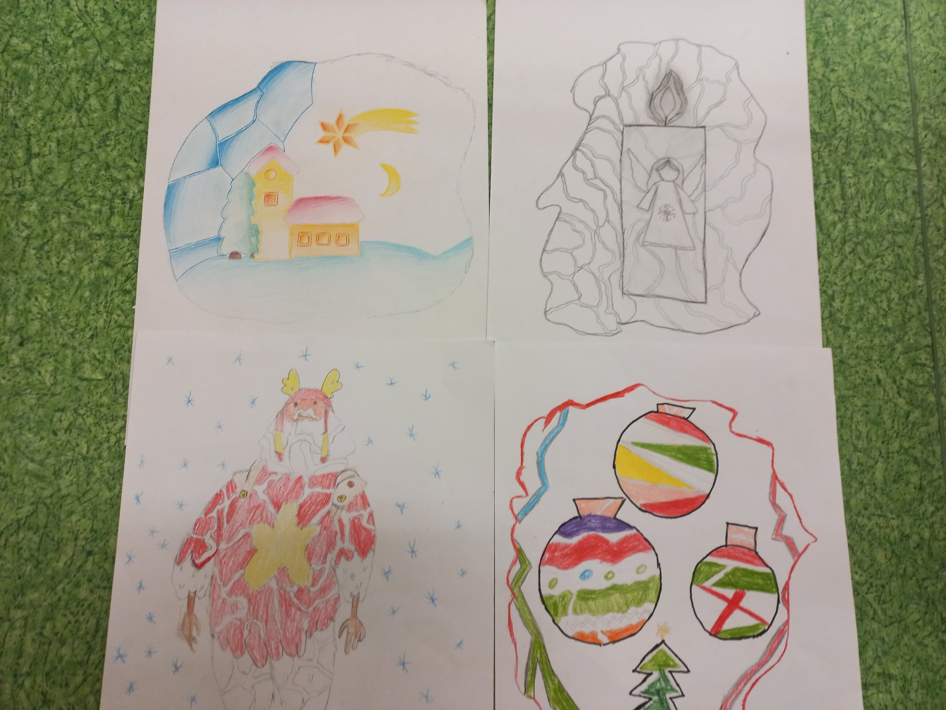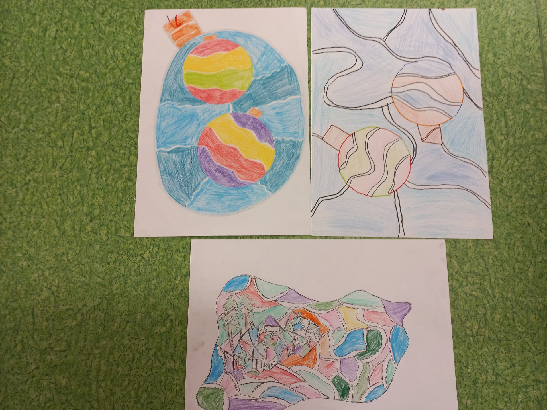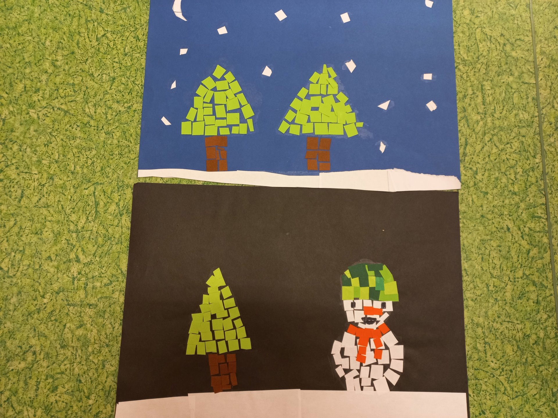V prosinci jsme začali s mozaikou. Nejprve děti dělaly papírovou mozaiku z barevných papírů, další hodinu jsme se věnovali mozaice kreslené pastelkami. Předvánoční období jsme uzavřeli kresbou motivů na vánoční tašky a vytvořením vánoční taštičky.