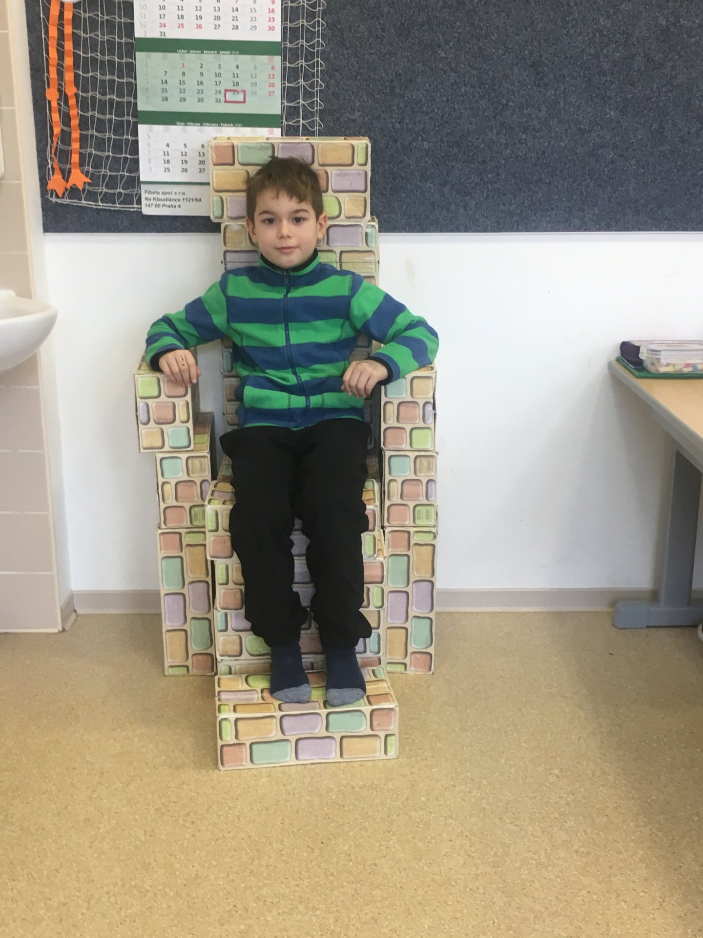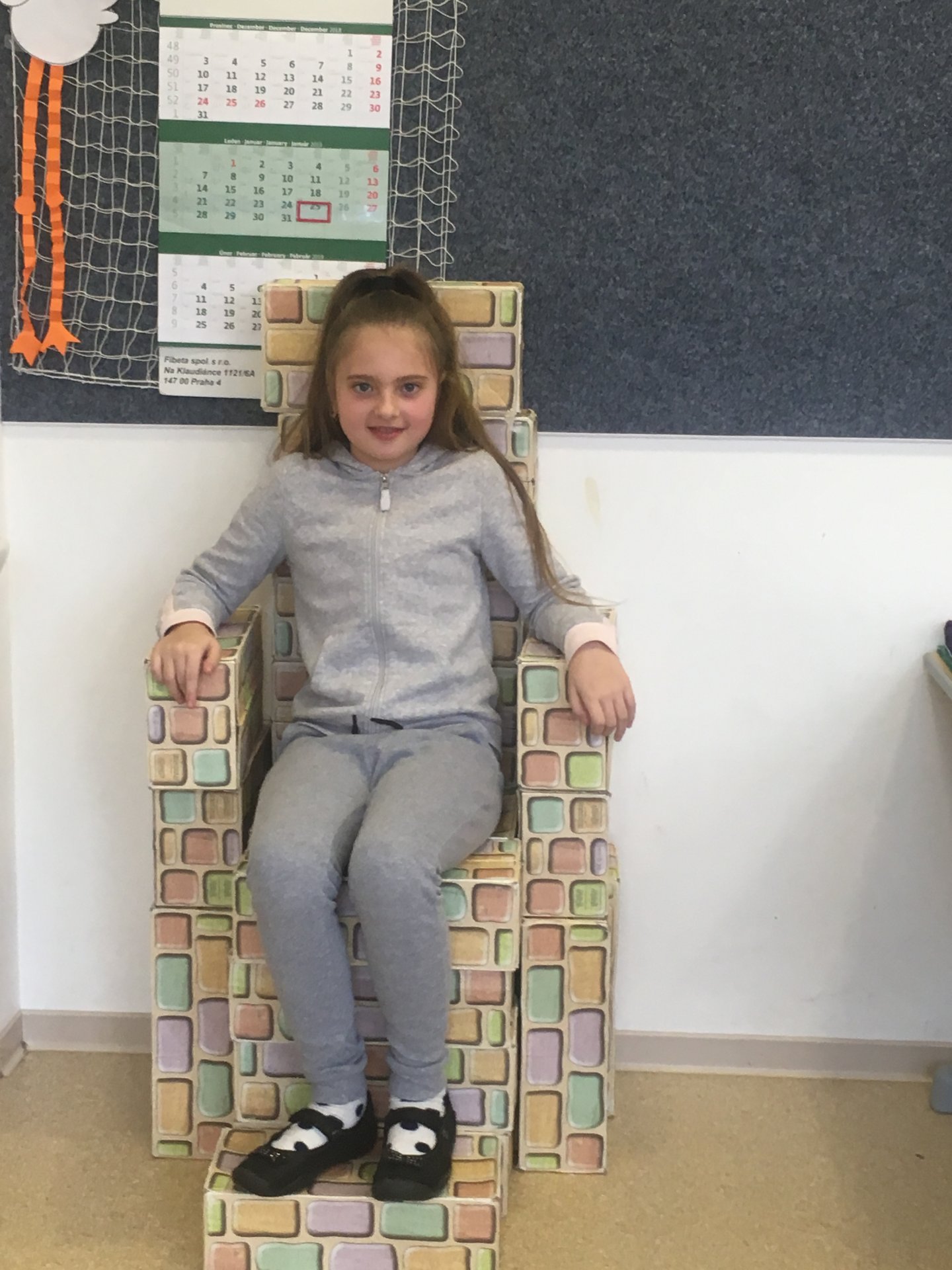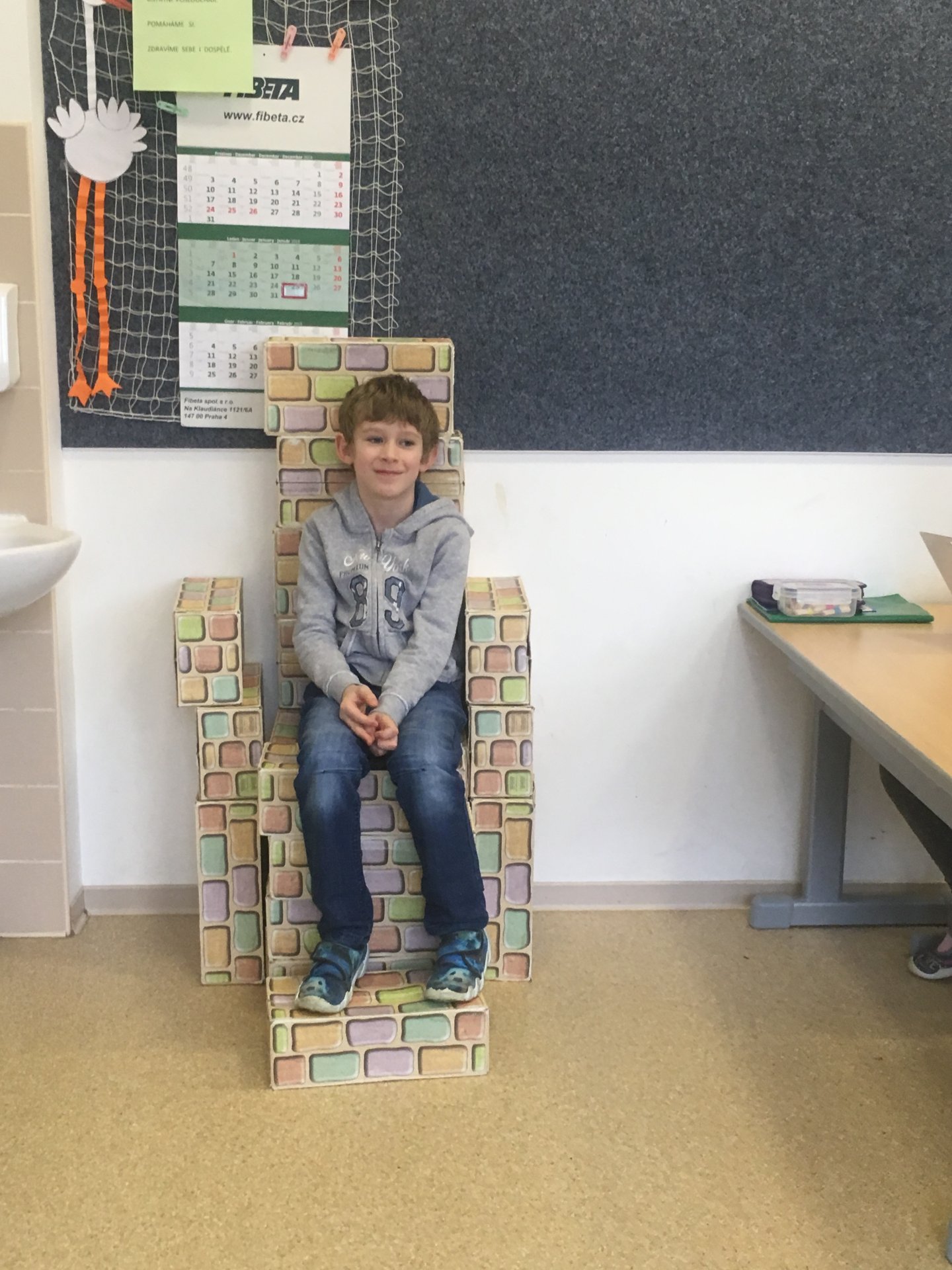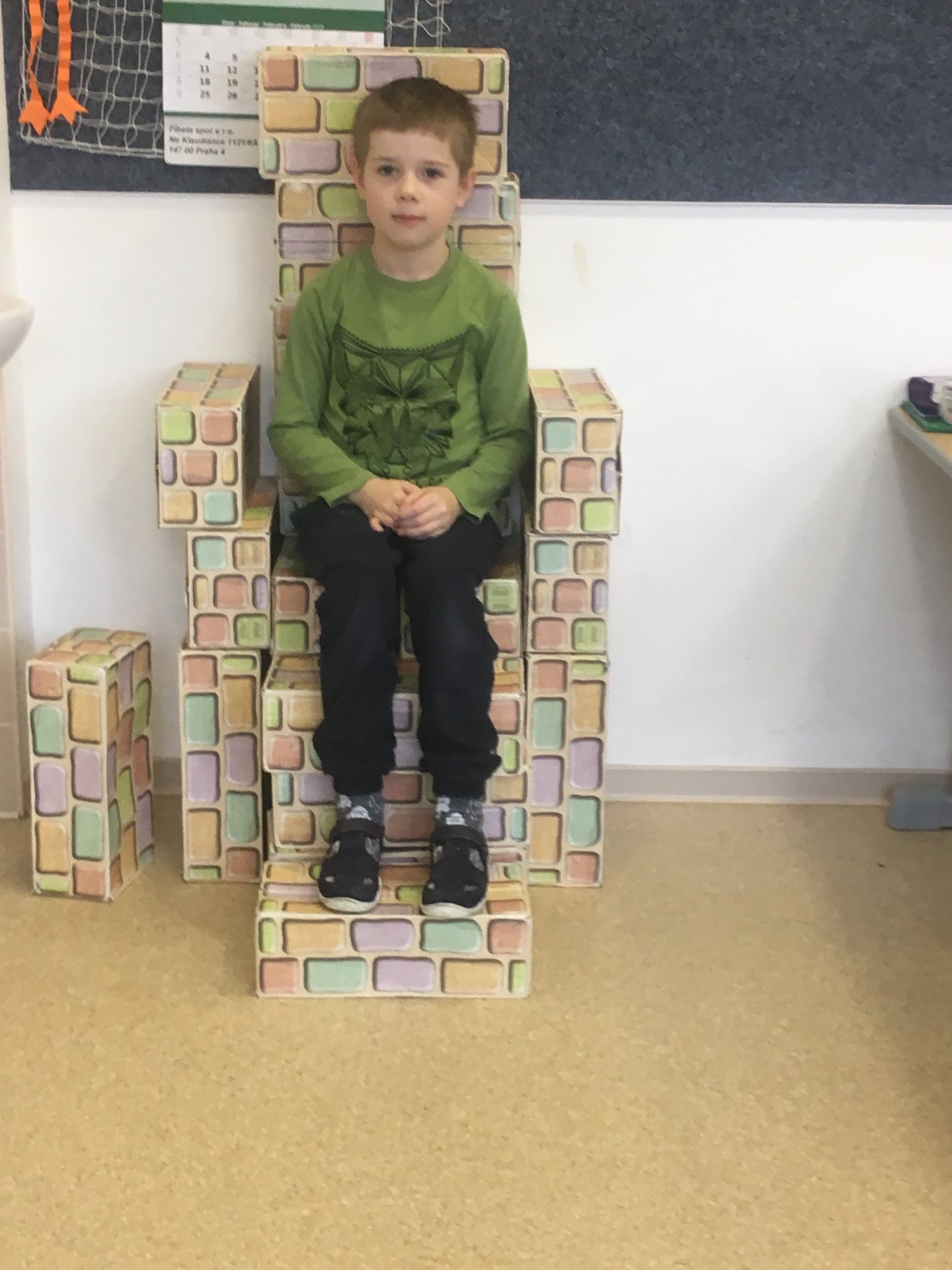 Z našich cihliček vznikají díky architektům z 2.A různé stavby. Tentokrát to bylo křeslo. Shodli jsme se na tom, že vypadá jako královské.