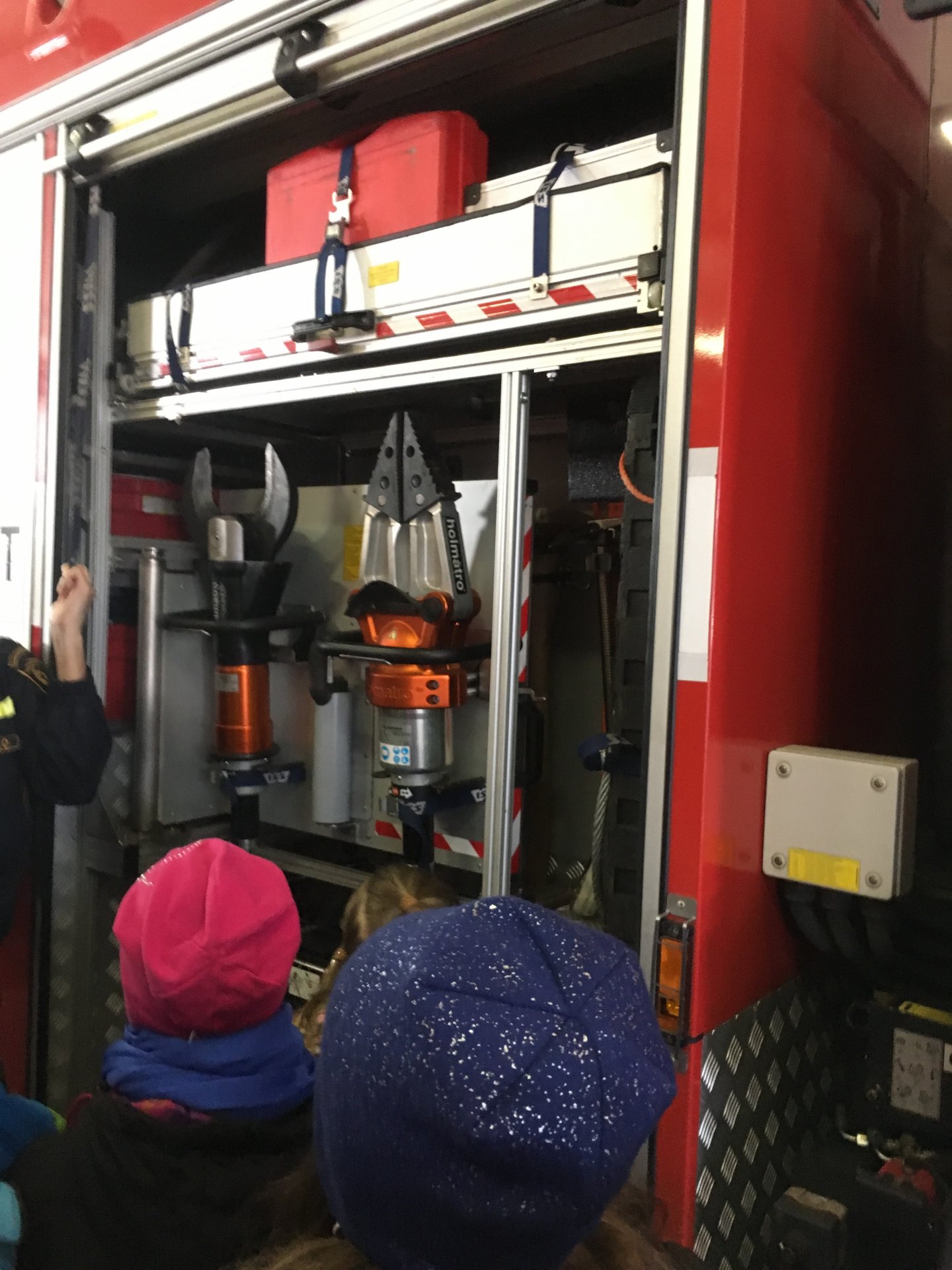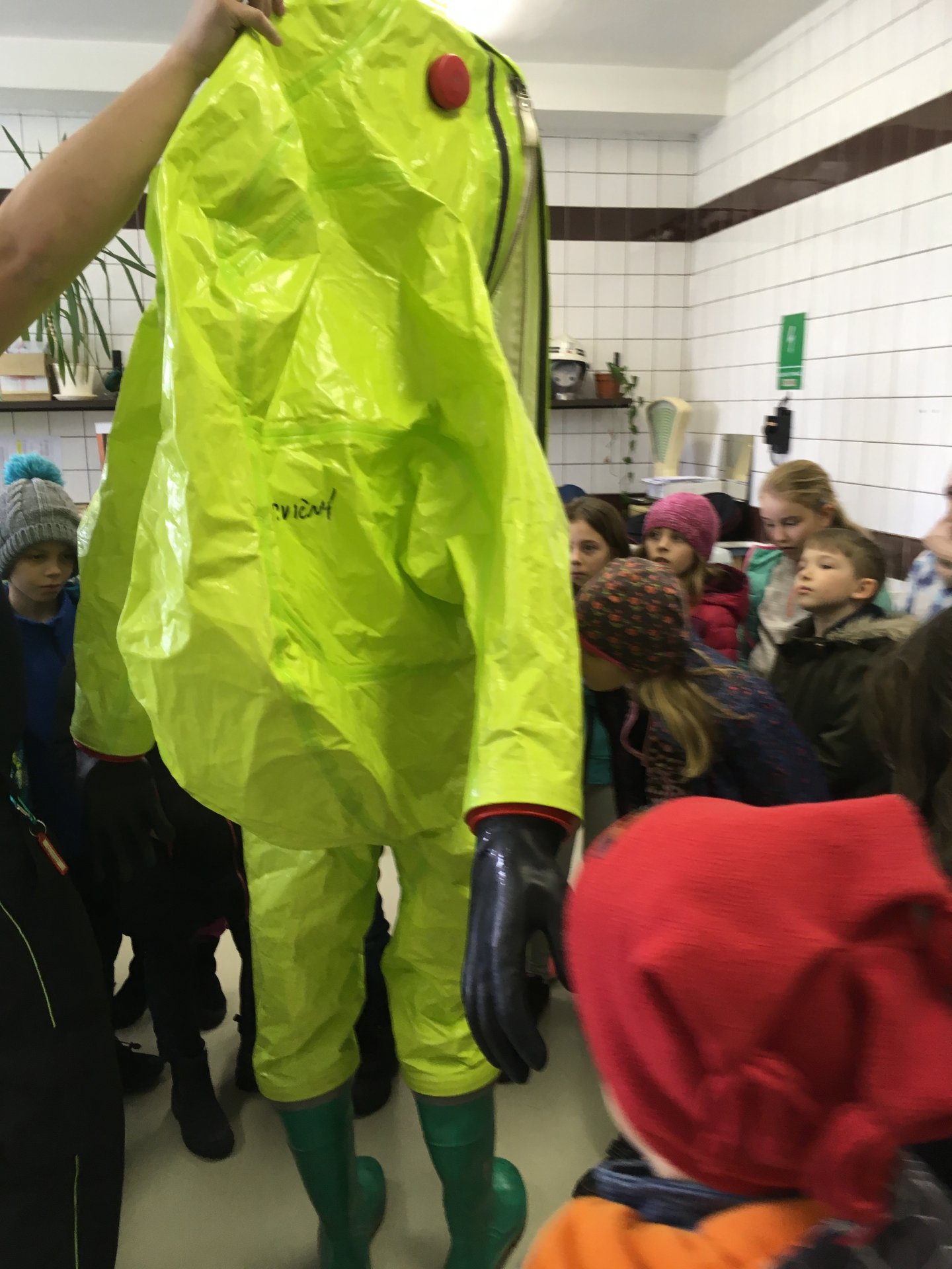 Po celou dobu se nám věnovala paní kapitánka. Nejprve nás v učebně seznámila s náročnou prací hasičů, vysvětlila, kromě jiného, rozdíl mezi suchým a mokrým hasičem. Poté nás zavedla do garáží. Tam na nás čekali páni hasiči.
