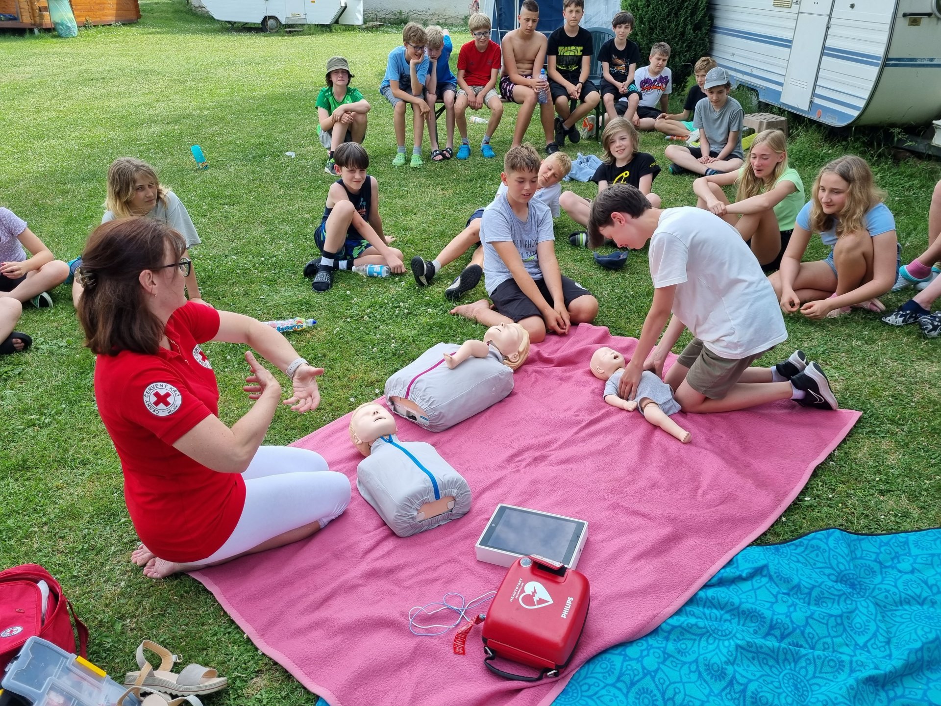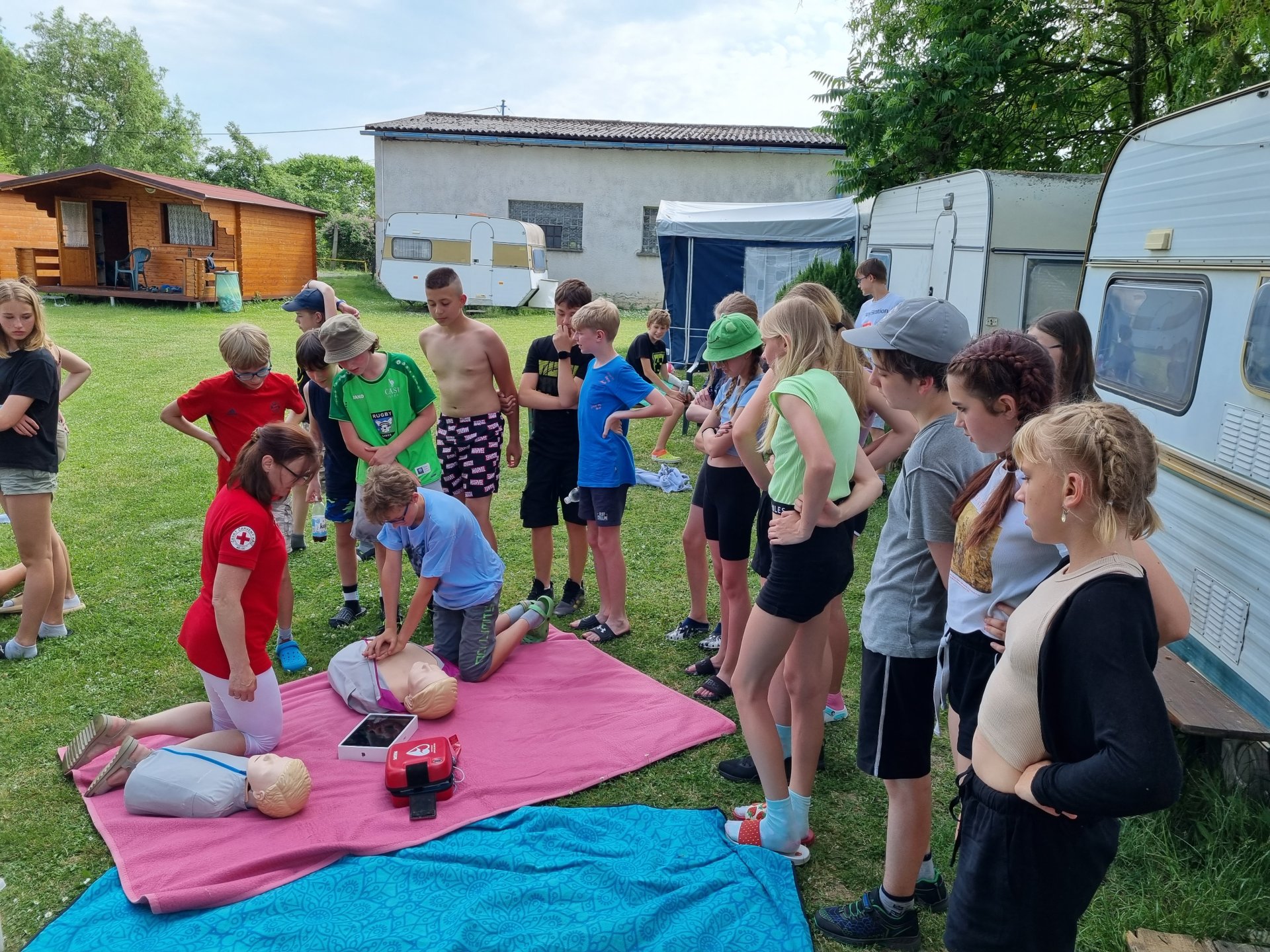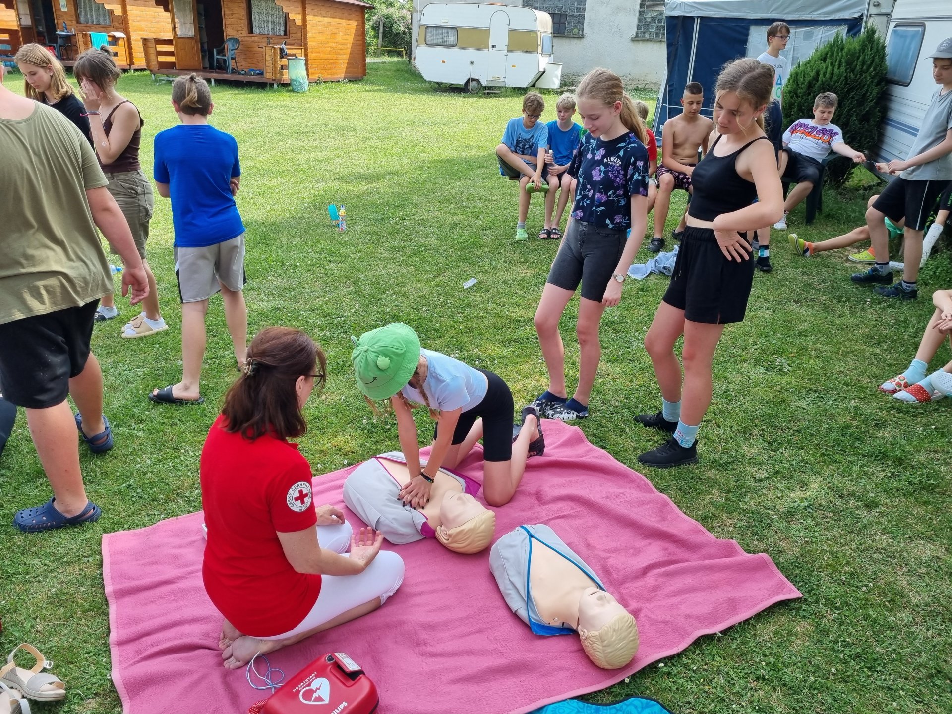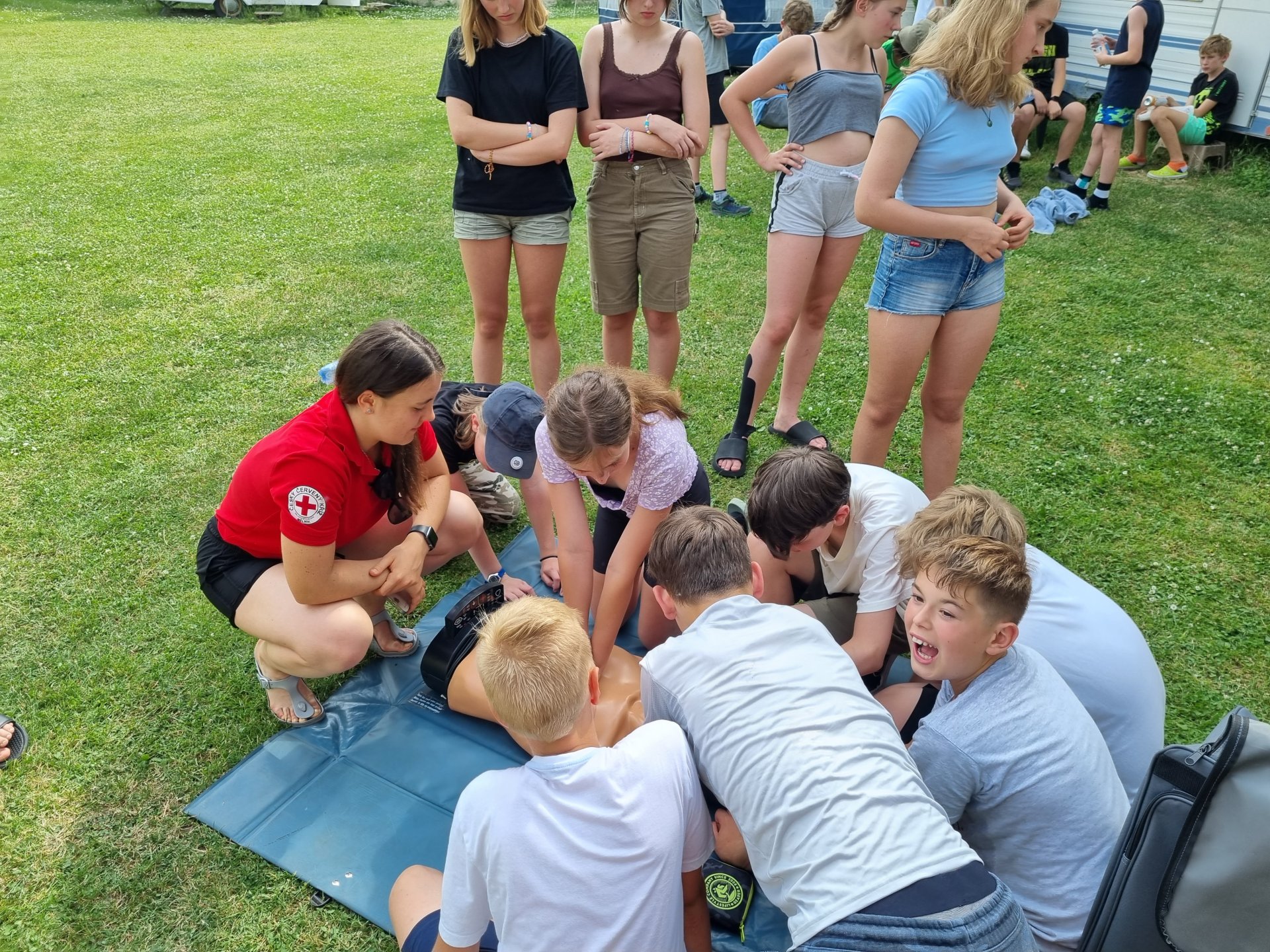 V úterý začalo výbornou snídání. Po snídani se děti účastnily aktivit na rozvoj komunikace. Dopoledne jsme věnovali výletu do okolí. Pro některé děti byla 6 km trať nejdelší, co kdy šly. Cestou bylo možné vlézt do různých jeskyní nebo navštívit Kokořínek. Zpátky cesta vedla podél třešňové aleje. Bohužel byl zralý pouze jeden strom. Po výborném obědě následoval zasloužilý polední klid. Odpoledne nás přijeli překvapit záchranářky z Českého červeného kříže z Mělníka. Děti si vyzkoušely, záklon hlavy, resuscitaci, zapojení AED, zotavovací polohu a nakonec si zahrály na masivní krvácení. Večer rychlá koupačka na koupališti a večer týmové hry.