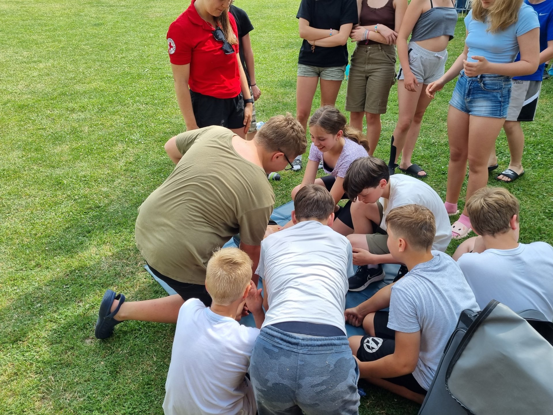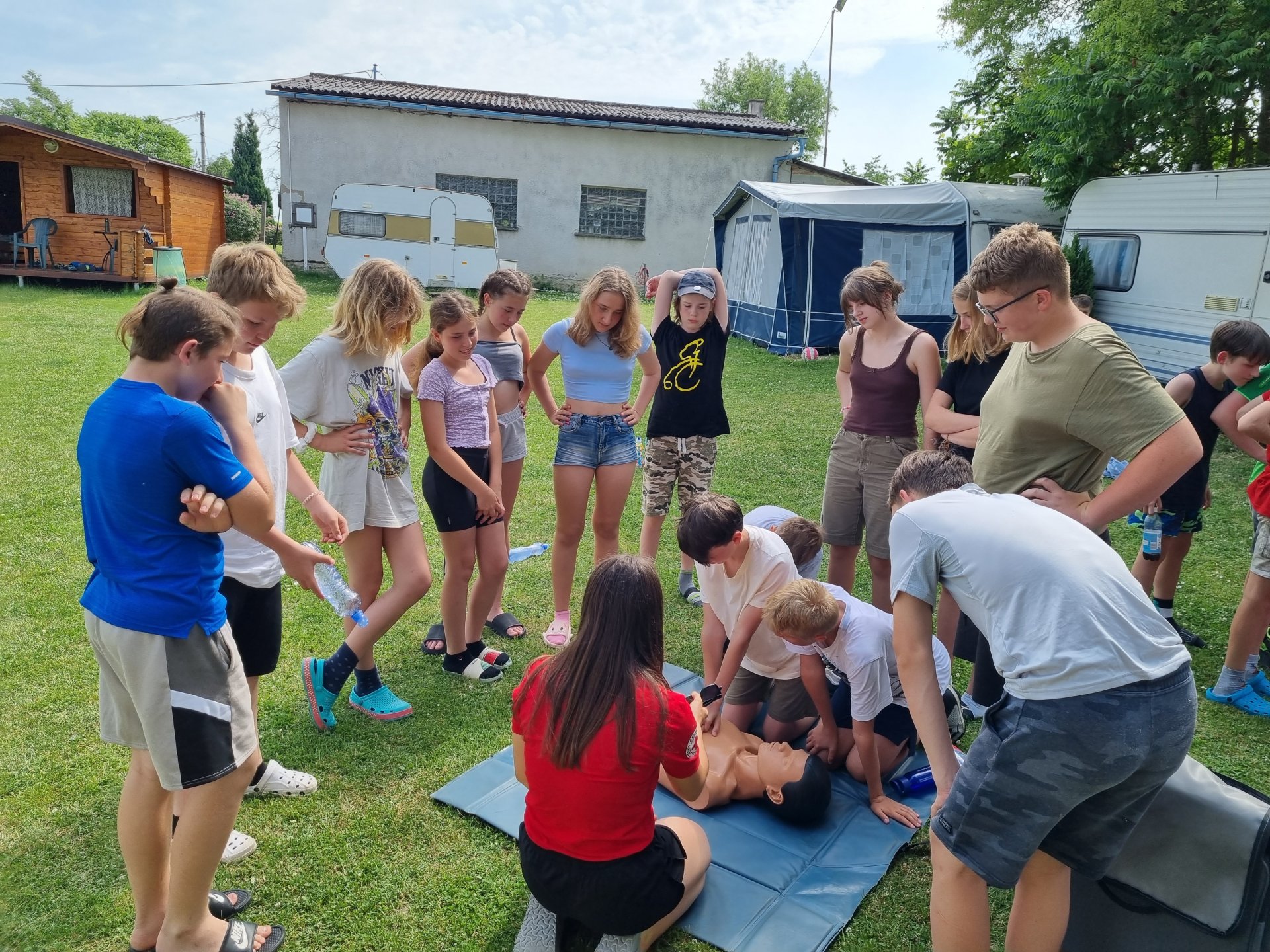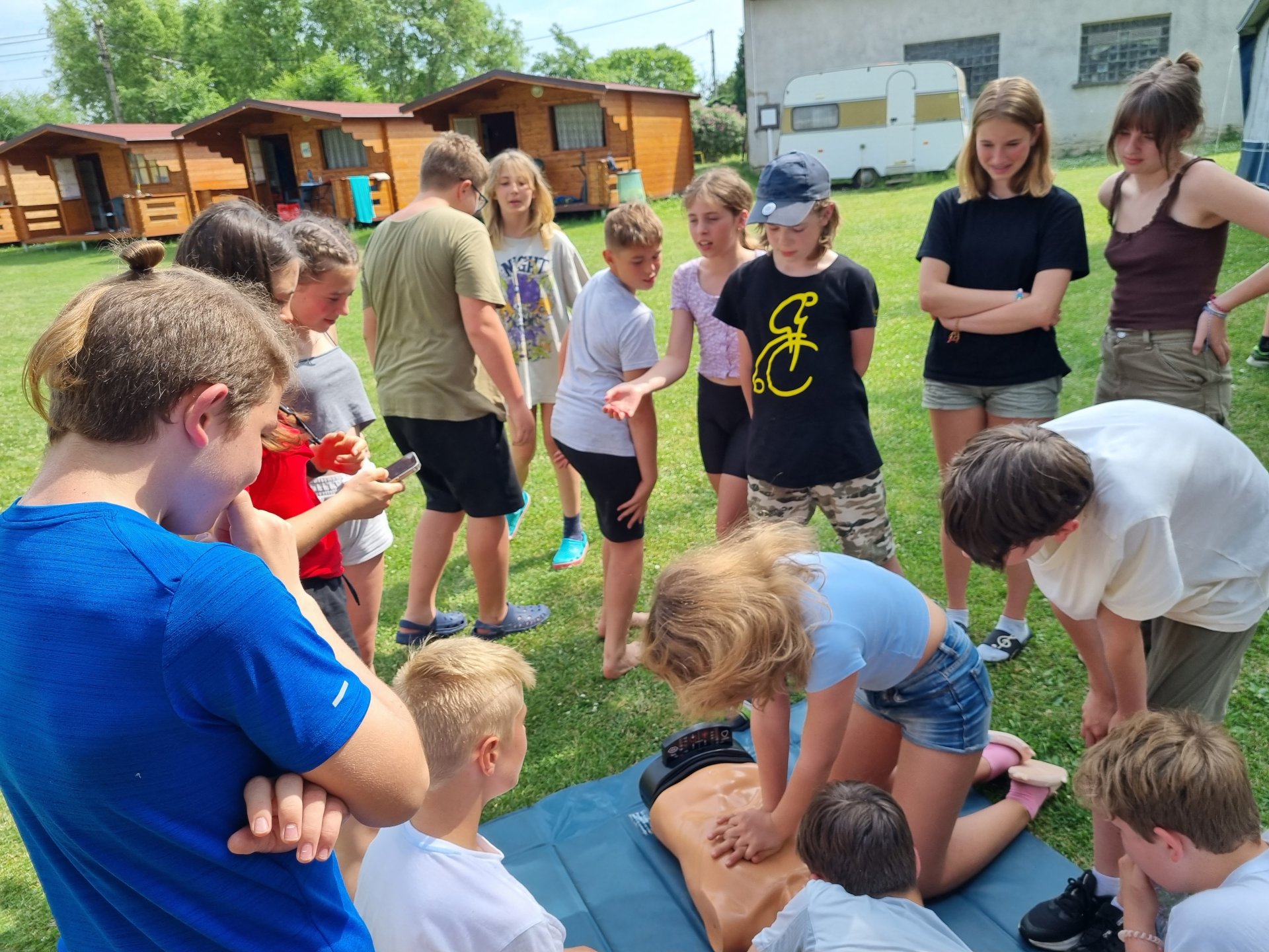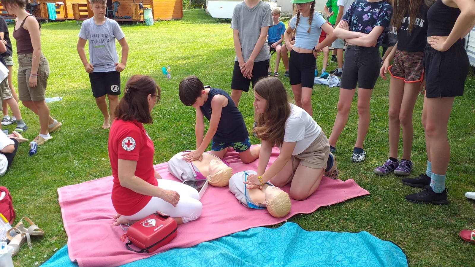 V úterý začalo výbornou snídání. Po snídani se děti účastnily aktivit na rozvoj komunikace. Dopoledne jsme věnovali výletu do okolí. Pro některé děti byla 6 km trať nejdelší, co kdy šly. Cestou bylo možné vlézt do různých jeskyní nebo navštívit Kokořínek. Zpátky cesta vedla podél třešňové aleje. Bohužel byl zralý pouze jeden strom. Po výborném obědě následoval zasloužilý polední klid. Odpoledne nás přijeli překvapit záchranářky z Českého červeného kříže z Mělníka. Děti si vyzkoušely, záklon hlavy, resuscitaci, zapojení AED, zotavovací polohu a nakonec si zahrály na masivní krvácení. Večer rychlá koupačka na koupališti a večer týmové hry.