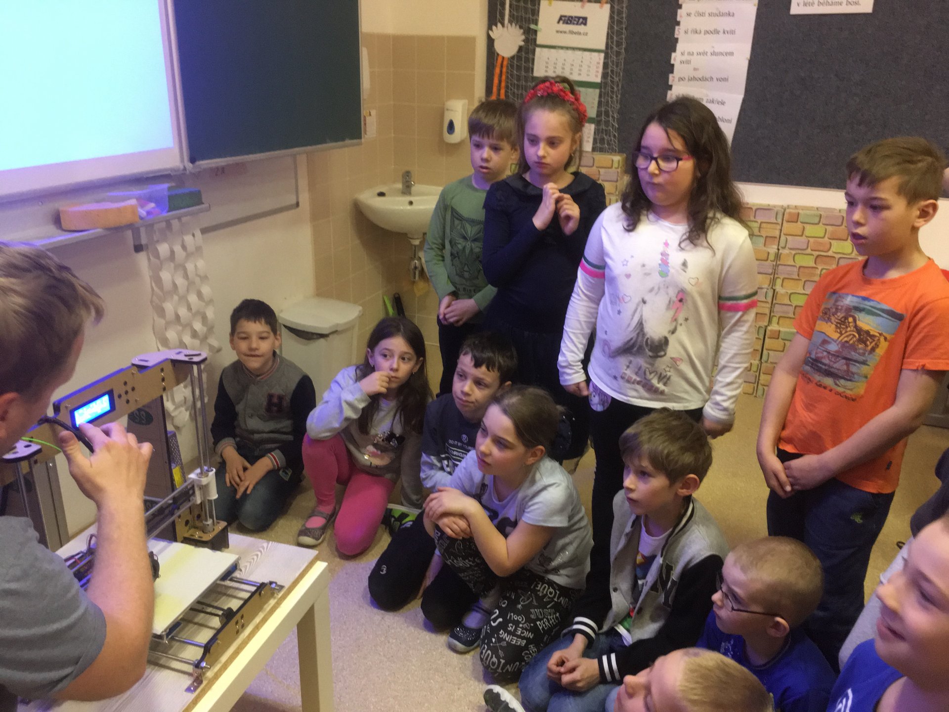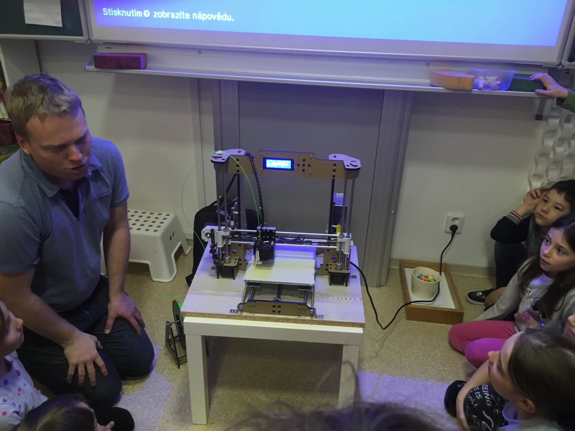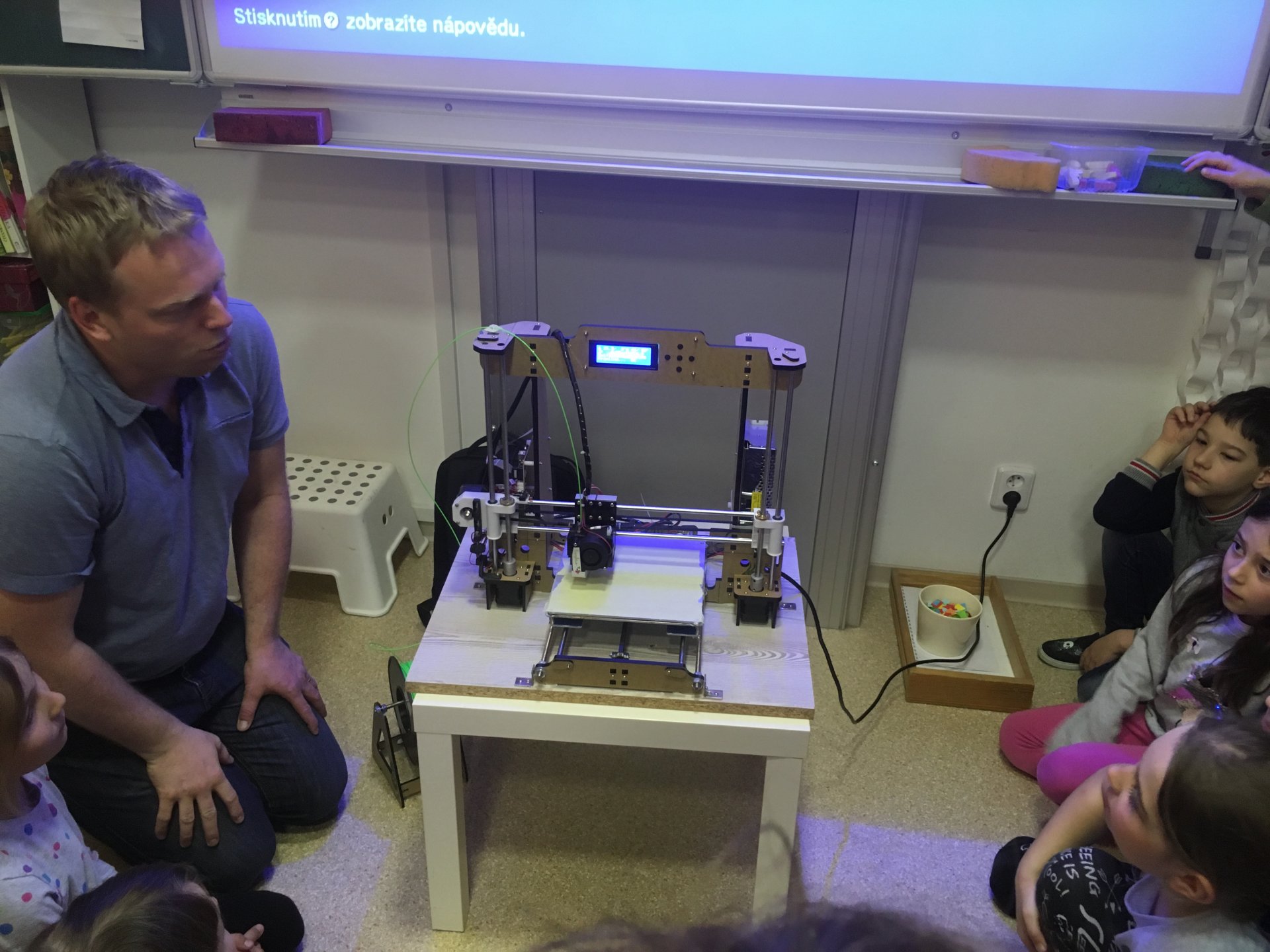 Aniččin tatínek nám nabídl, že by mohl přijít ukázat trošku jinou možnost práce s počítačem. To jsme rádi uvítali. Tatínek přišel a s sebou přinesl 3D tiskárnu. Nejprve nám moc hezky a hlavně přiměřeně našemu věku pověděl, jak 3D tiskárna funguje, co se dá tisknout. Přinesl ukázat i vytištěná zvířátka. Pak jsme na vlastní oči viděli, jak se tiskne šablona nebo forma ve tvaru 3.A. To byl dárek pro nás na příští školní rok. Panu Schindlerovi moc děkujeme a budeme rádi, když ho budou další rodiče následovat.