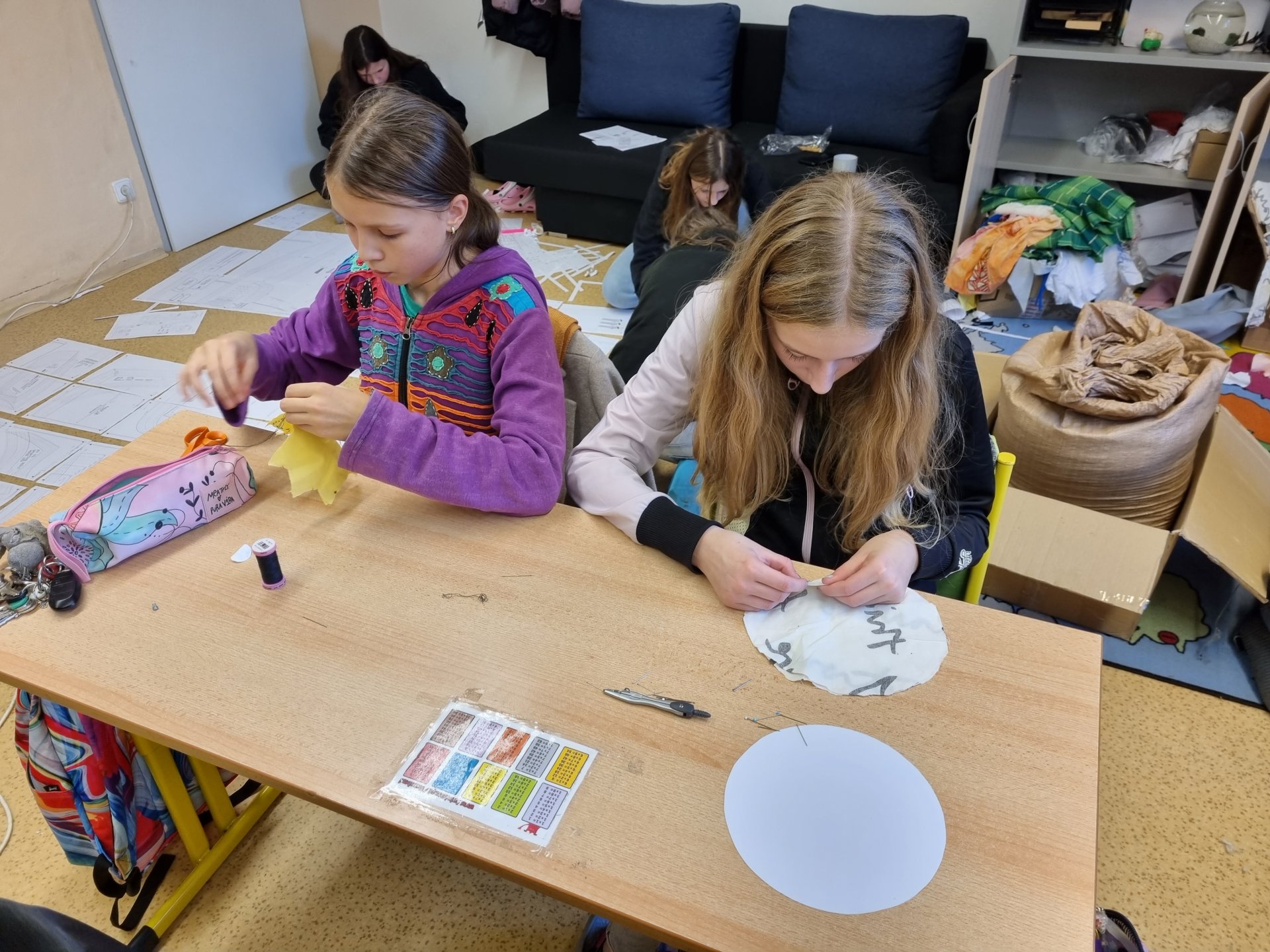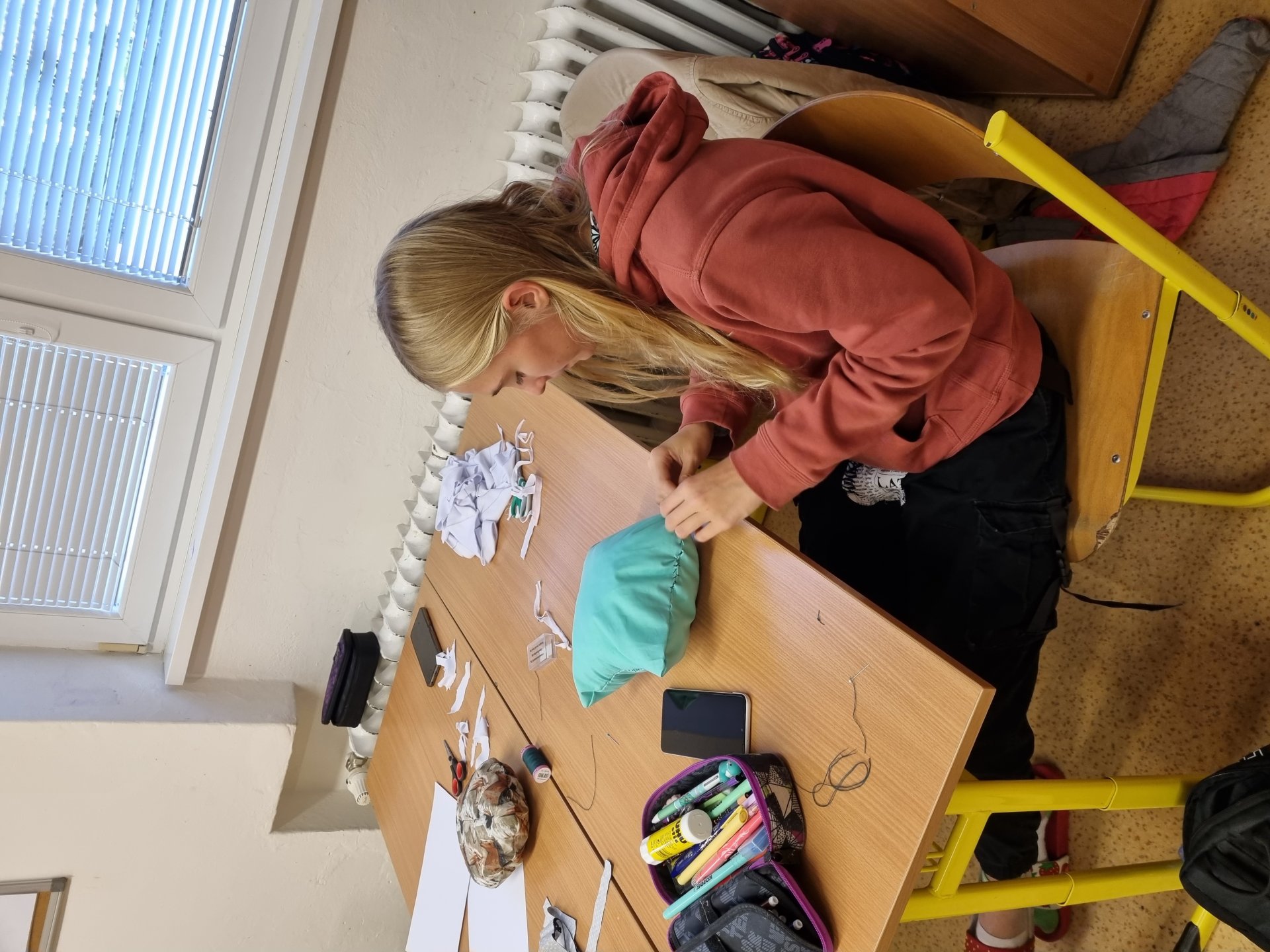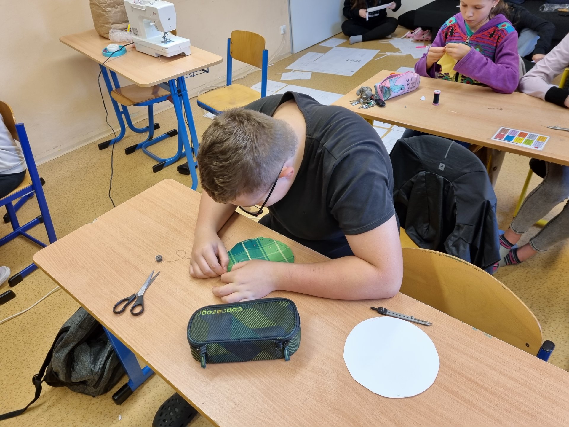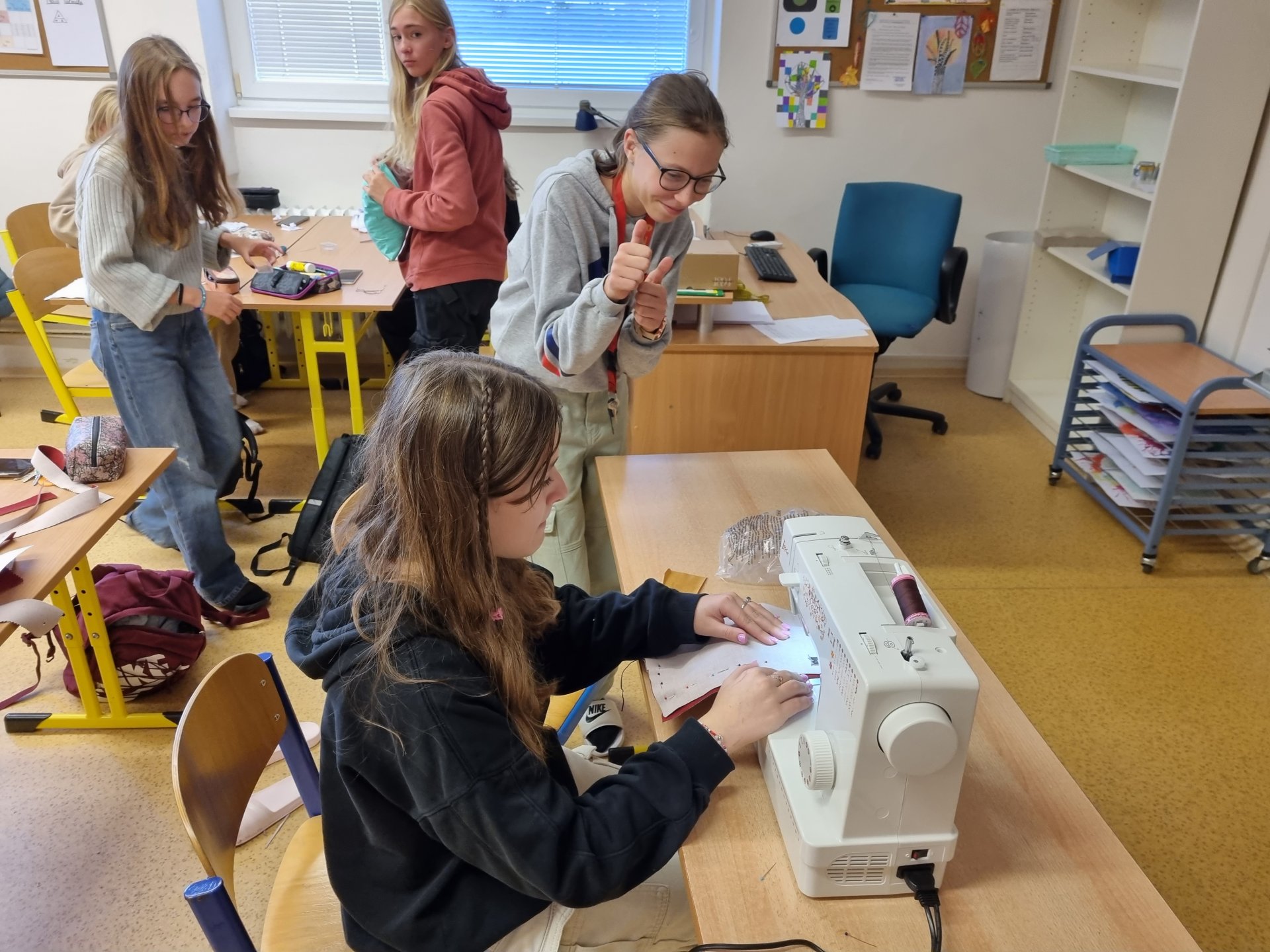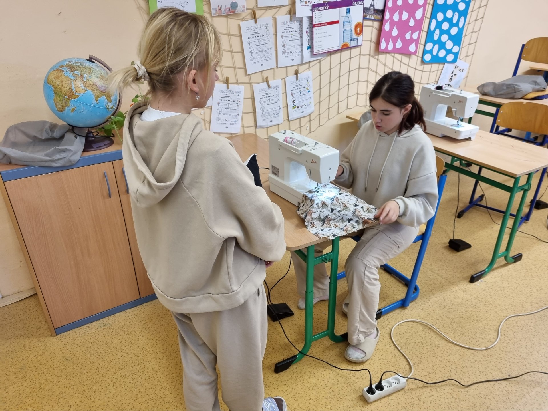 Od září opět máme volitelný předmět šití. Na začátku jsme šili ručně, teď už děti "válí" na strojích.