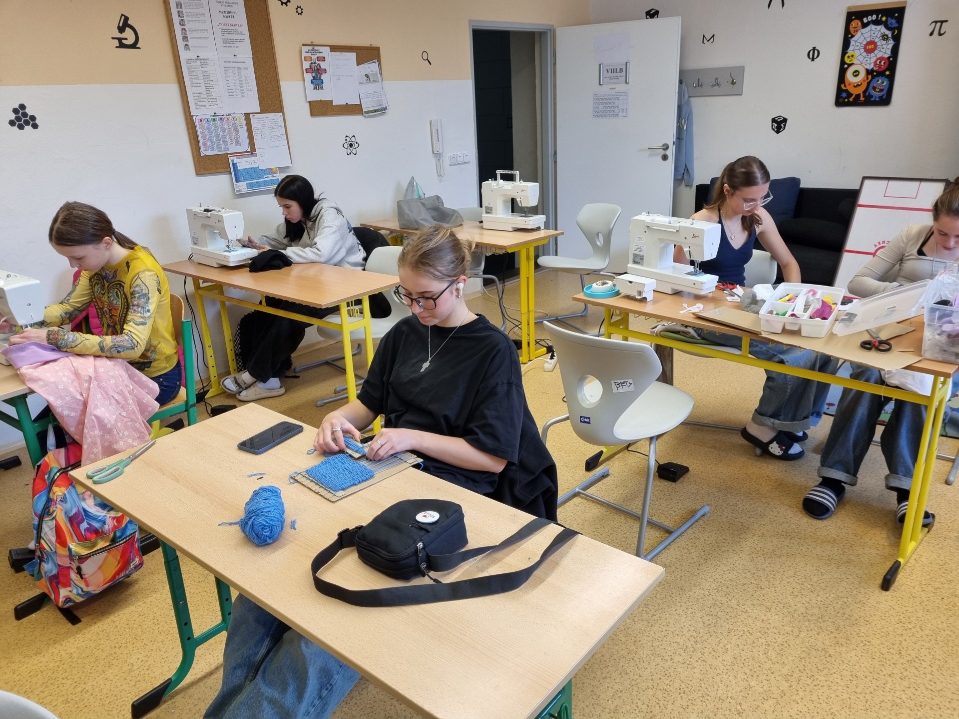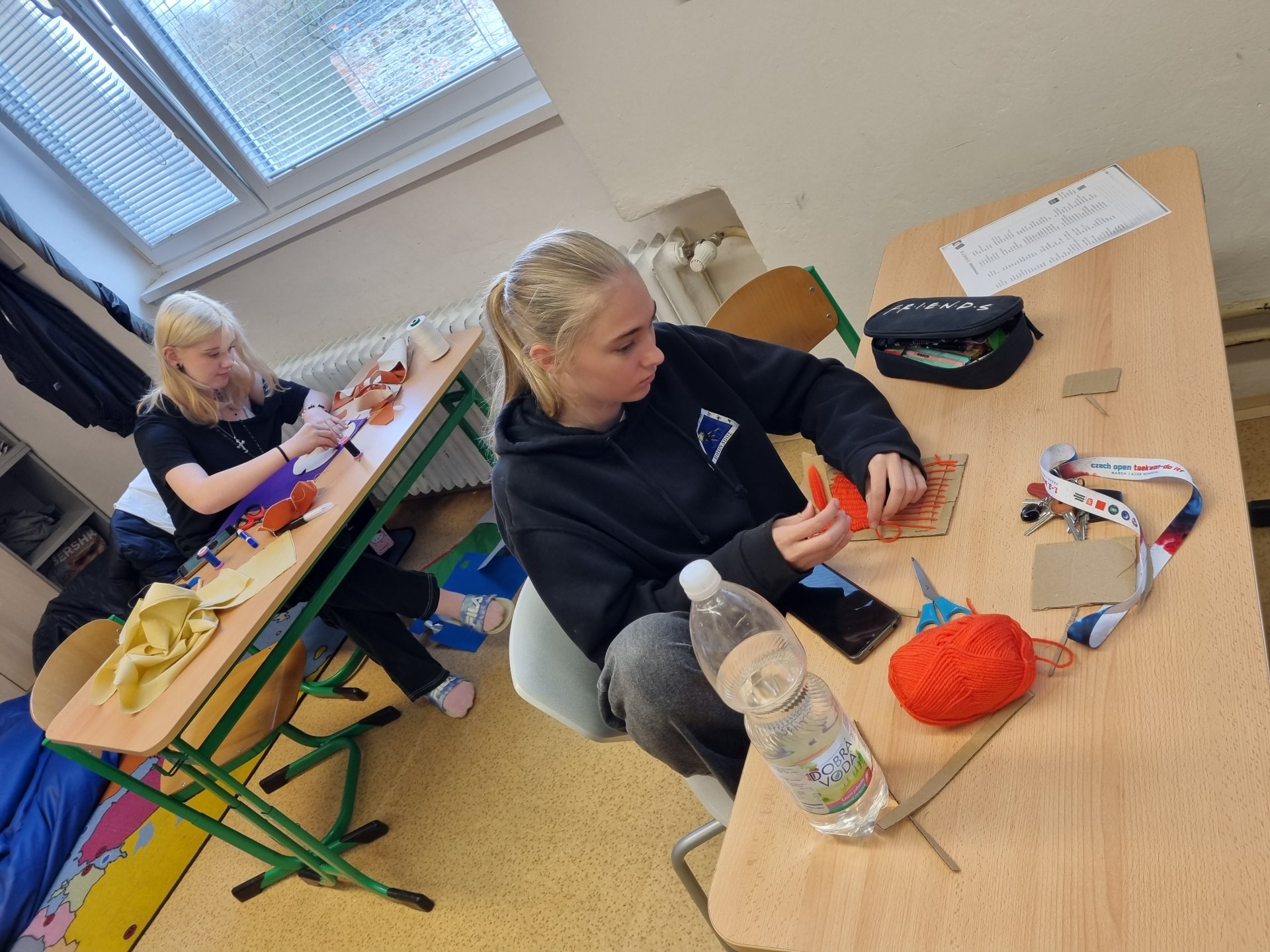 Zpestření výuky šití jde i kartónem. Navlečeme vlnu a pracujeme. Koberečky se za chvilku rýsují. Děvčata byla velmi rychlá a práce jim šla hezky od ruky.