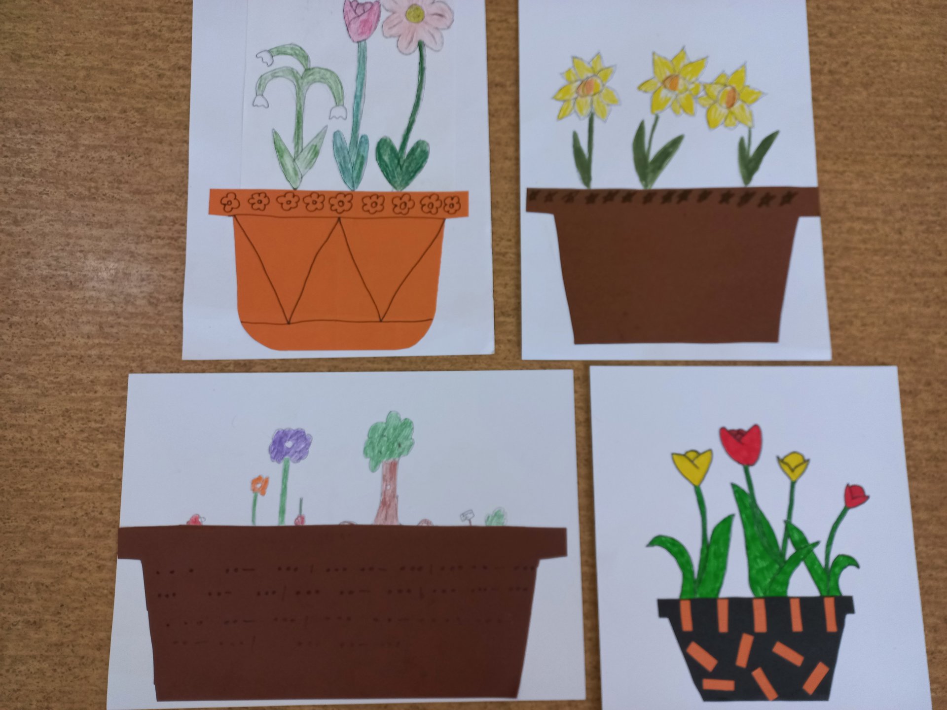 V dubnu jsme začali s jarní výzdobou. Žáci tvořili tvořili přáníčka v Velikonocům. Zaměřili jsme se také na kresbu ptactva a výrobu květináče (vázy) z barevného papíru + kresbu květin.