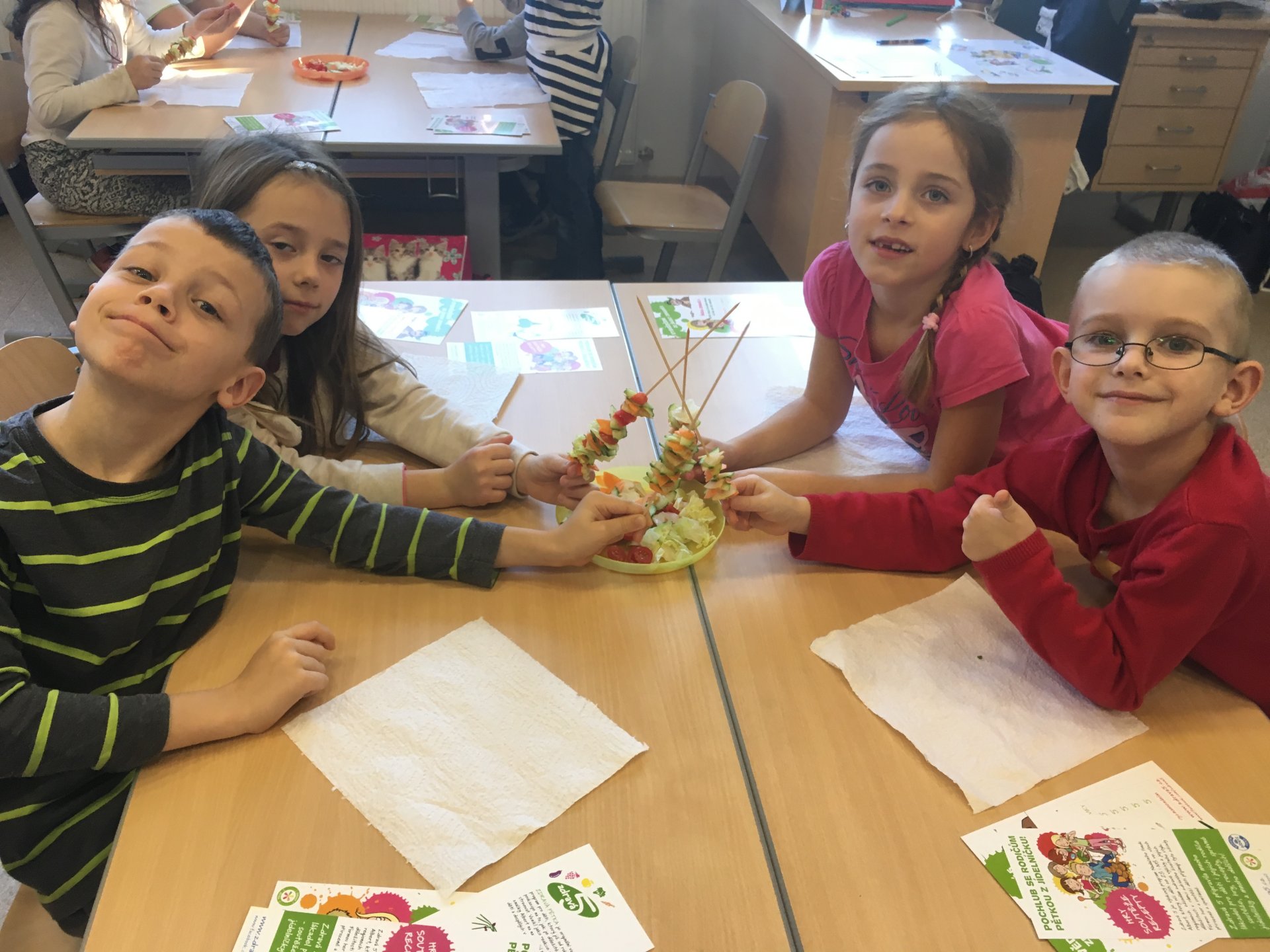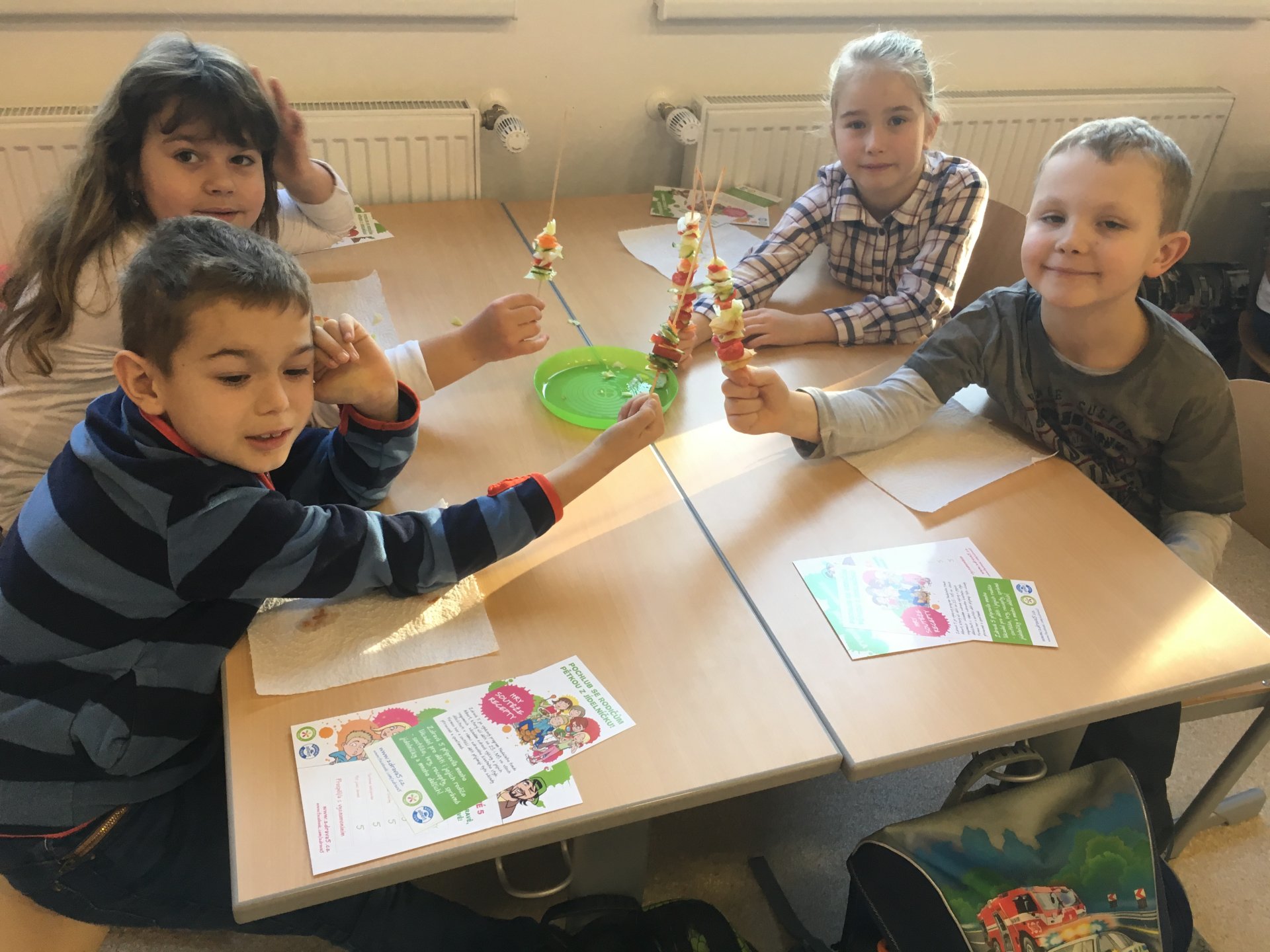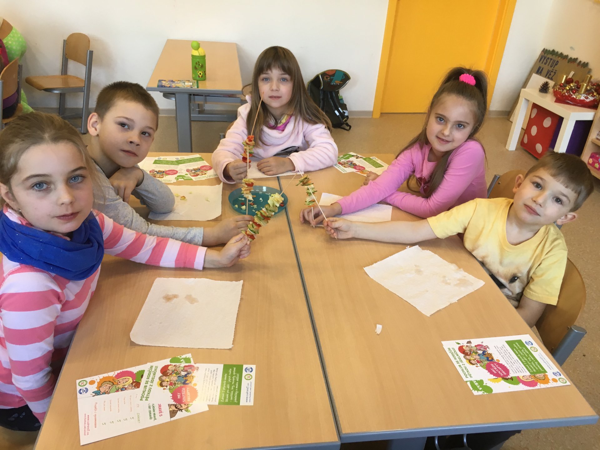 Povídání o zdravém stravování skončilo pro všechny z nás zdravou pětkou a diplomem. Už víme, co má být součástí správného jídelníčku, co je zdravé pít a jak přeslazená jsou mnohá dobře chutnající pitíčka. V praktické části jsme si zahráli hru a udělali jsme si vitamínový špíz. Zakončení bylo nejlepší - všem nám chutnalo a všechno jsme snědli. Pochvala nás neminula.