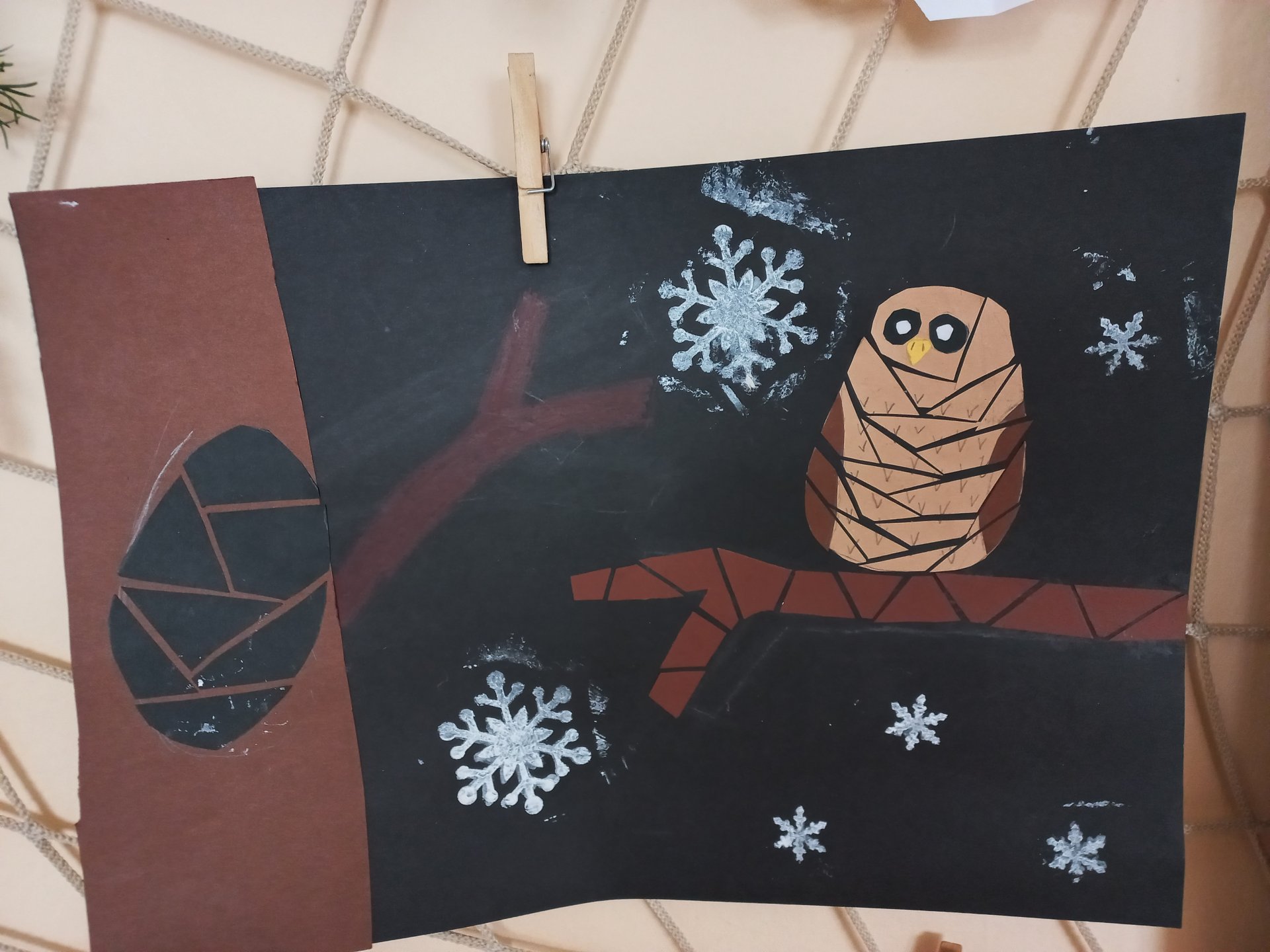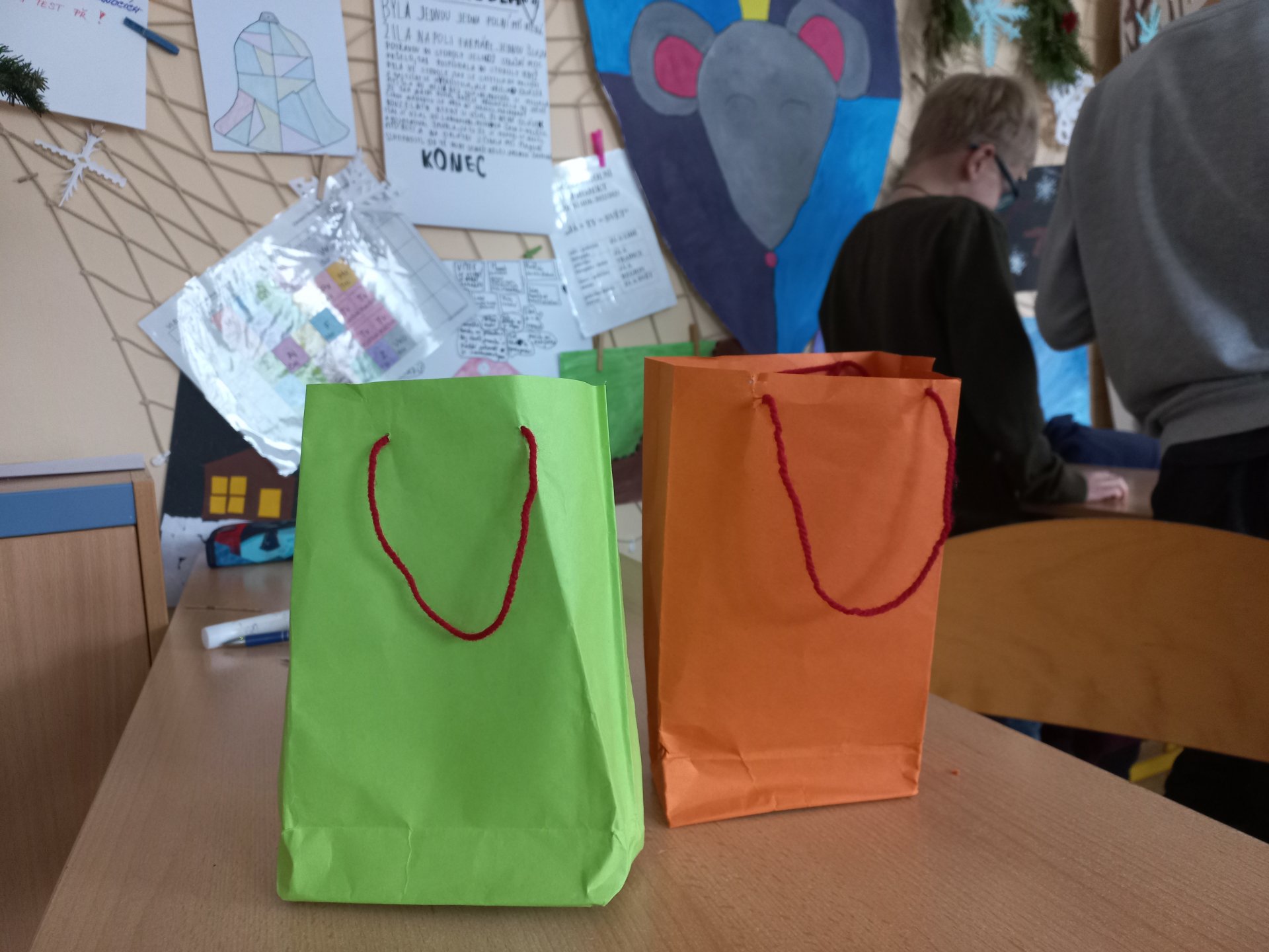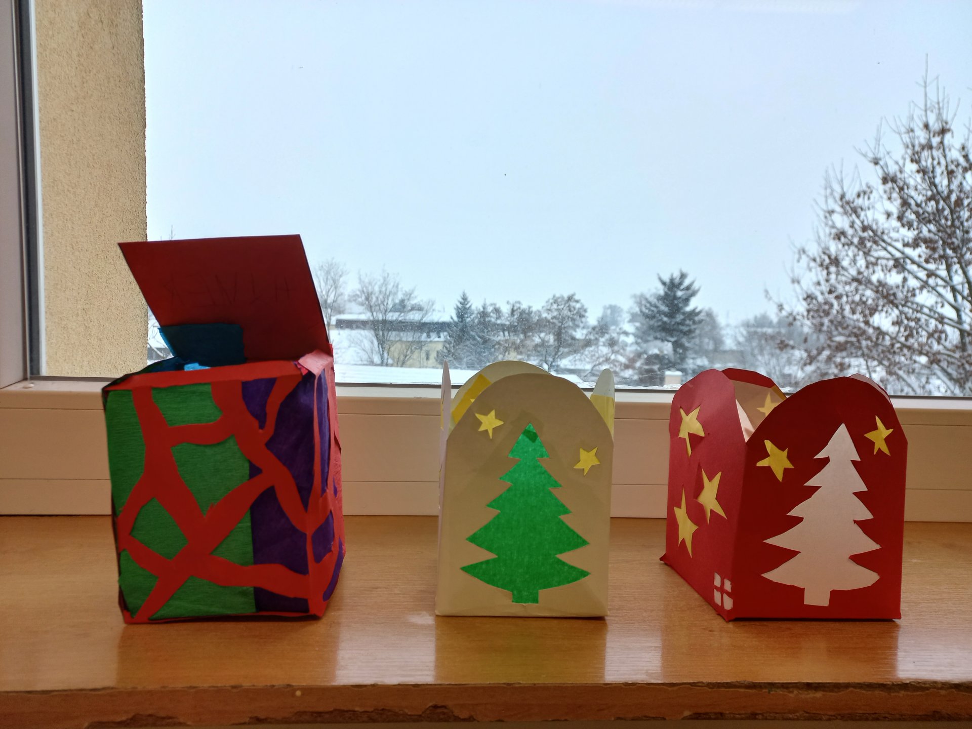 V listopadu si děti vyzkoušely tzn. “solený akvarel” a vznikaly tak hezké díla, která byla inspirovaná vesmírem. Dalším tématem bylo tvoření papírové lucerny, kdy děti vyzkoušely svou zručnost při vystřihování okének a tvarů, kterými prochází světlo. V rámci výzdoby školy děti dělaly originální návrhy na vánoční ozdoby (zvonek, baňka,..). Následovalo zpracování zimní mozaiky z papíru, dále malba temperovými barvami “Lední medvěd a polární záře”. Před Vánoci se děti učily vyrábět tašky, do kterých mohou svým blízkým dávat dárky.